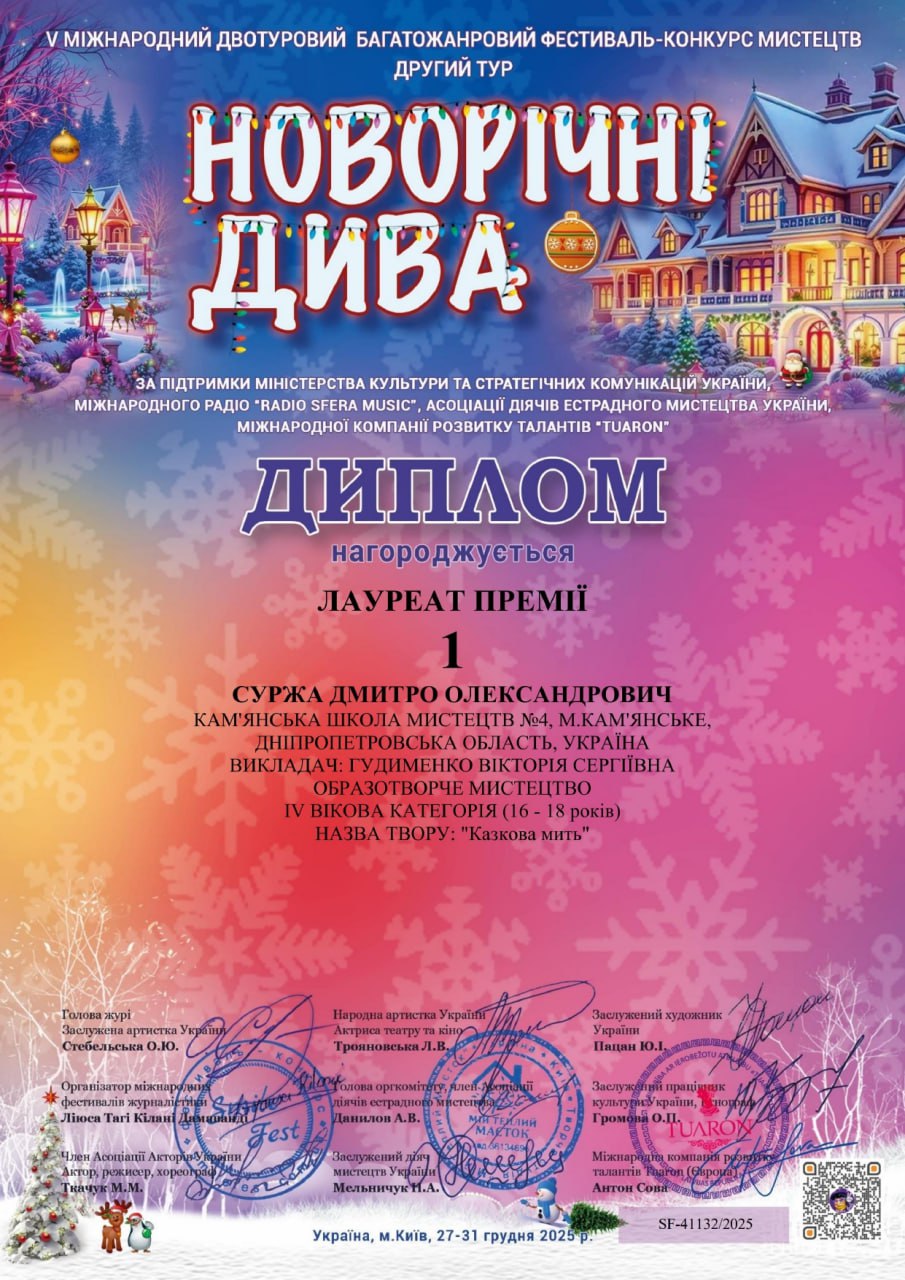 Учень художнього відділення Дмитро Суржа взяв участь у V Міжнародному двотуровому багатожанровому фестивалі-конкурсі мистецтв “Новорічні дива“, що проходив з 27 по 31 грудня минулого року в Києві. За рішенням журі він став лауреатом І премії (номінація “Образотворче мистецтво”) за творчу роботу “Казкова мить”.