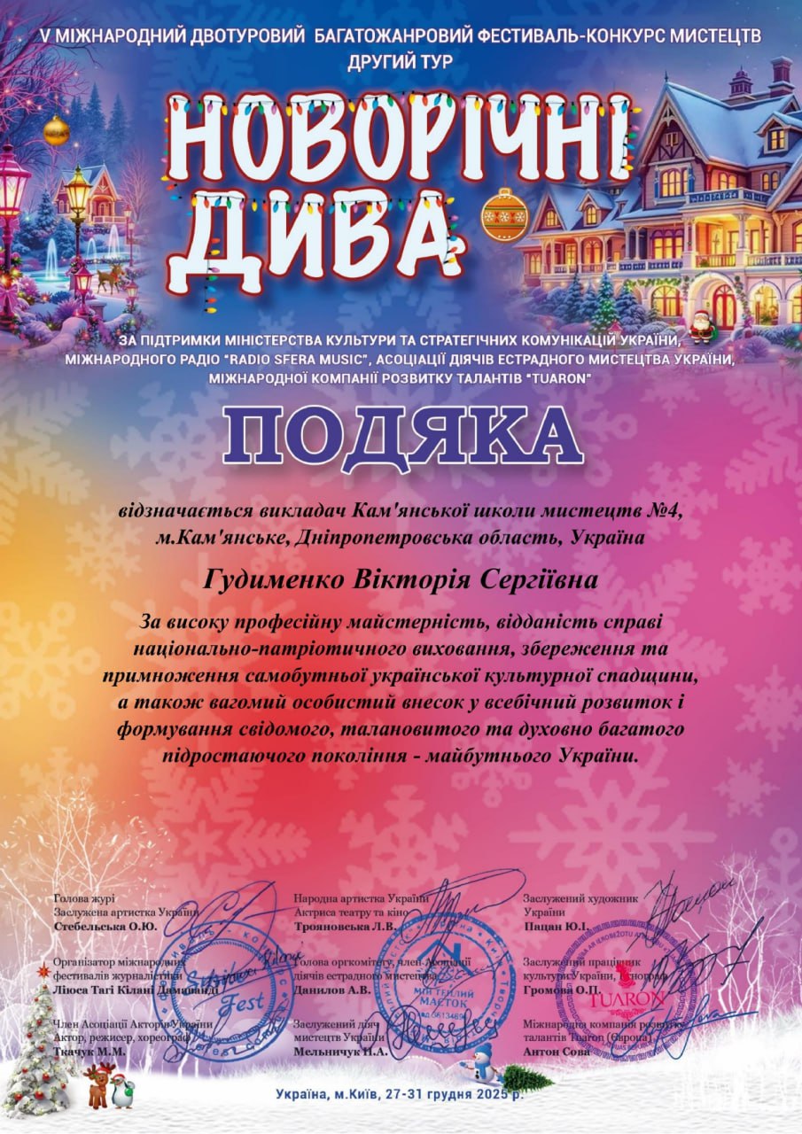 Викладач Вікторія Гудименко отримала подяку за професійну майстерність, відданість справі національно-патріотичного виховання, розвиток і формування свідомого талановитого та духовно багатого підростаючого покоління.