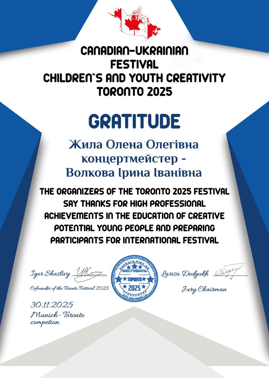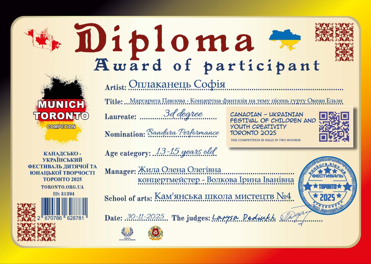 30 листопада 2025 року в Торонто відбувся Canadian-Ukrainian Festival of Children and Youth Creativity, Toronto 2025. Школу мистецтв № 4 гідно представила талановита учениця Софія Оплаканець. Юна бандуристка була нагороджена дипломом лауреата ІІІ ступеня за концертну фантазію на тему пісні гурту “Океан Ельзи”.
