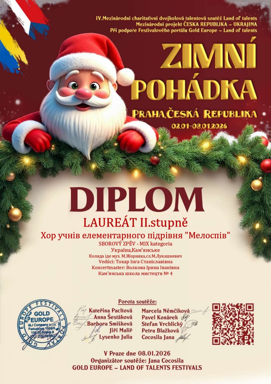 Особливої уваги заслуговує хор учнів елементарного підрівня “Мелоспів”, який гідно представив Україну на IV Міжнародному благодійному двотуровому конкурсі талантів Zimní pohádka (“Зимова казка”), який проходив у столиці Чехії Празі з 2 по 8 січня.