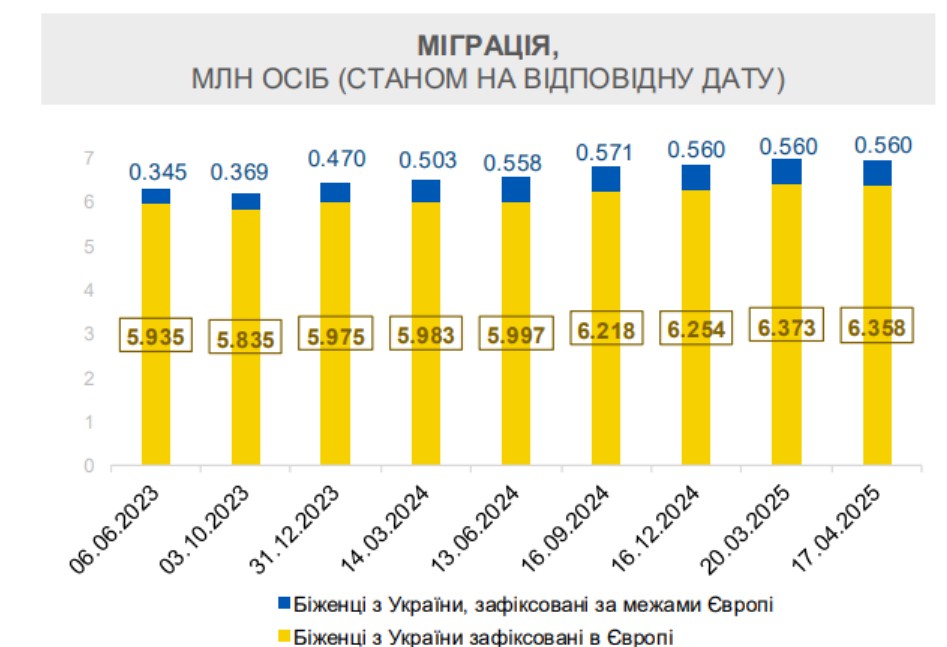 Згідно з інформацією Агентства ООН у справах біженців, станом на 17 квітня 2025 року по всьому світу налічувалося 6,918 млн українських біженців. З них 6,358 млн перебувають у Європі, а 0,56 млн – за її межами. Примітно, що з 16 грудня 2024 року кількість біженців у Європі зросла на 104 тисячі.