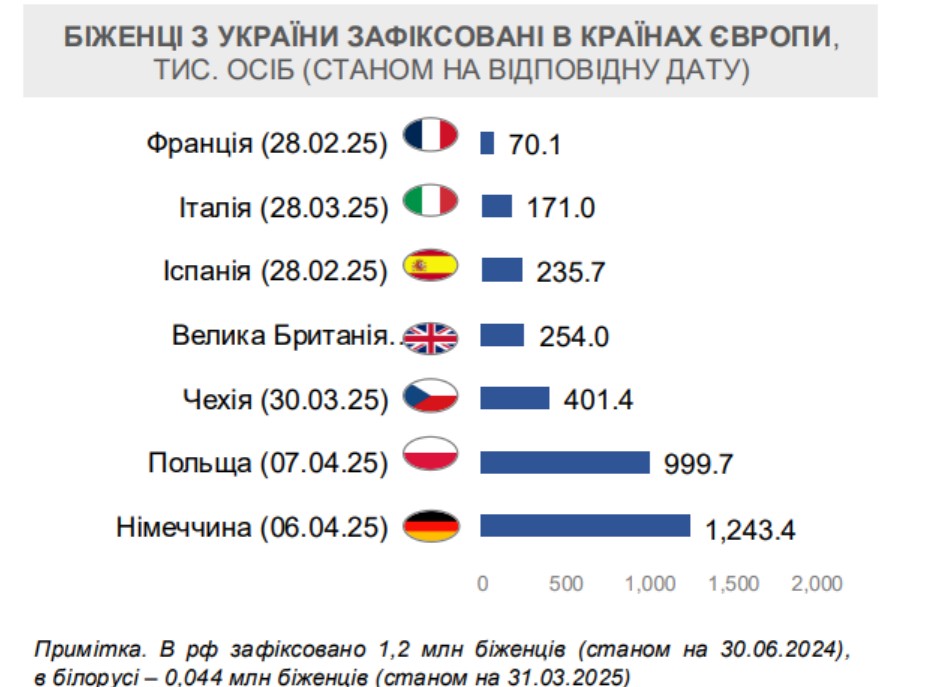 Варто зазначити, що біженці також перебувають у РФ (1,2 млн станом на 30 червня 2022 року) та Білорусі (44 тис. станом на 31 березня 2025 року).