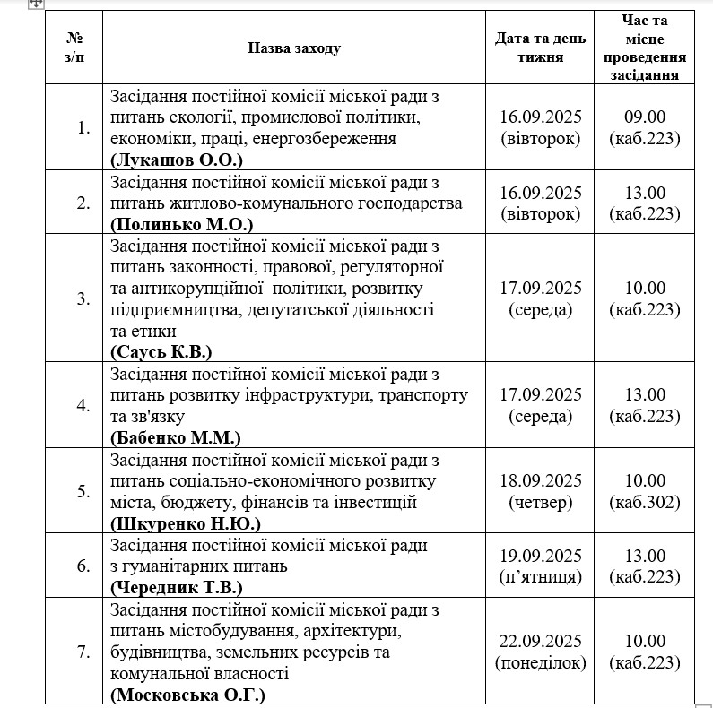 Засідання постійних комісій КМР пройдуть з 16 по 26 вересня.