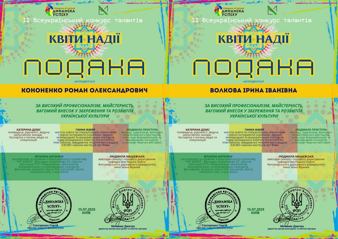 Викладач Роман Кононенко та концертмейстер Ірина Волкова нагороджені подяками за високий професіоналізм, майстерність, вагомий внесок у розвиток культури.