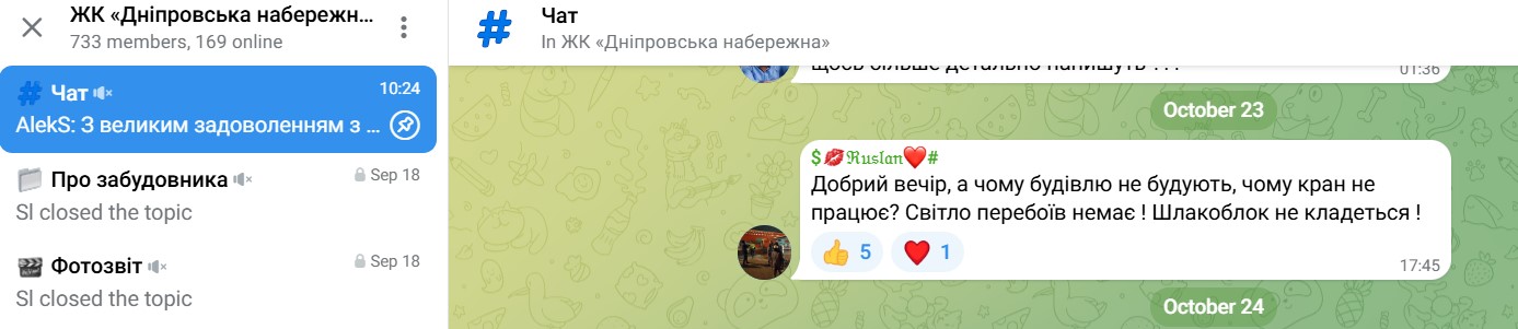 Дещо прояснили ситуацію на телеграм-каналі ЖК “Дніпровська набережна”. На днях один із читачів запитав у чаті: