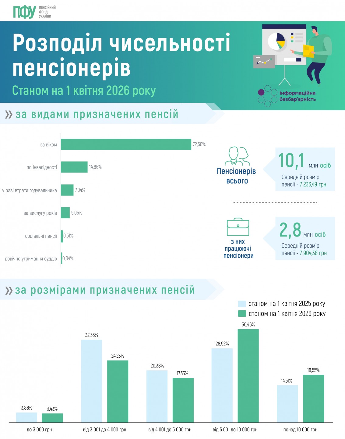 Згідно з даними ПФУ, станом на 1 квітня 2026 року налічується 10,1 млн пенсіонерів. Середній розмір пенсії становить 7236,49 грн. Більшість (72,5%) отримують пенсію за віком. На другому місці (14,86%) – по інвалідності. У разі втрати годувальника кошти отримують 7,04% пенсіонерів та 5,05% – за вислугу років.