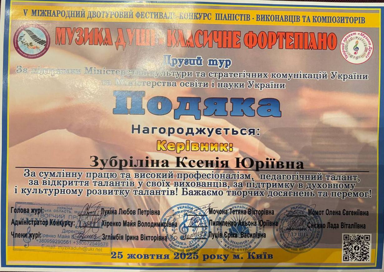 Викладач Ксенія Зубріліна отримала від організаторів конкурсу подяку за сумлінну працю та високий професіоналізм, педагогічний талант, за відкриття талантів у своїх вихованців, за підтримку в духовному і культурному розвитку талантів.