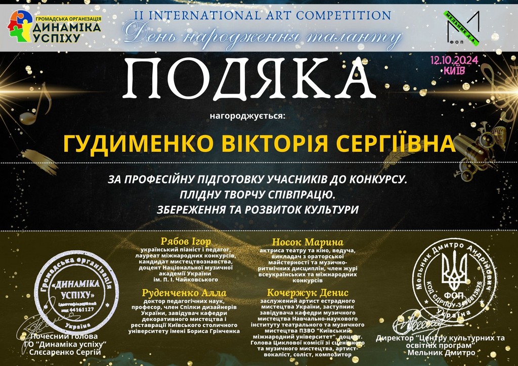 У Києві 12 жовтня відбувся Міжнародний конкурс мистецтв “День народження таланту”. Захід проводився у дистанційному форматі за підтримки громадської організації “Динаміка успіху”.