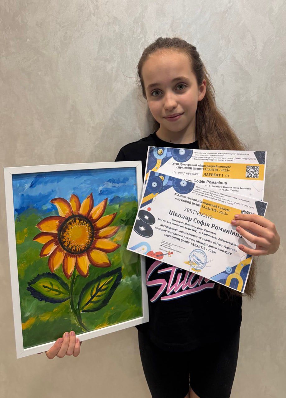 Серед цього сузір’я обдарованих конкурсантів яскраво засяяла зірка Софії Школяр, учениці відділення образотворчого мистецтва школи. Дівчинка представила на суд журі свою творчу роботу під назвою «Сонячна квітка України» та здобула диплом лауреата І ступеня. Вона також отримала сертифікат, який надає їй право на безкоштовну участь у наступних конкурсах. Це не лише приємний бонус, а й потужний стимул для подальшого творчого розвитку та нових звершень.