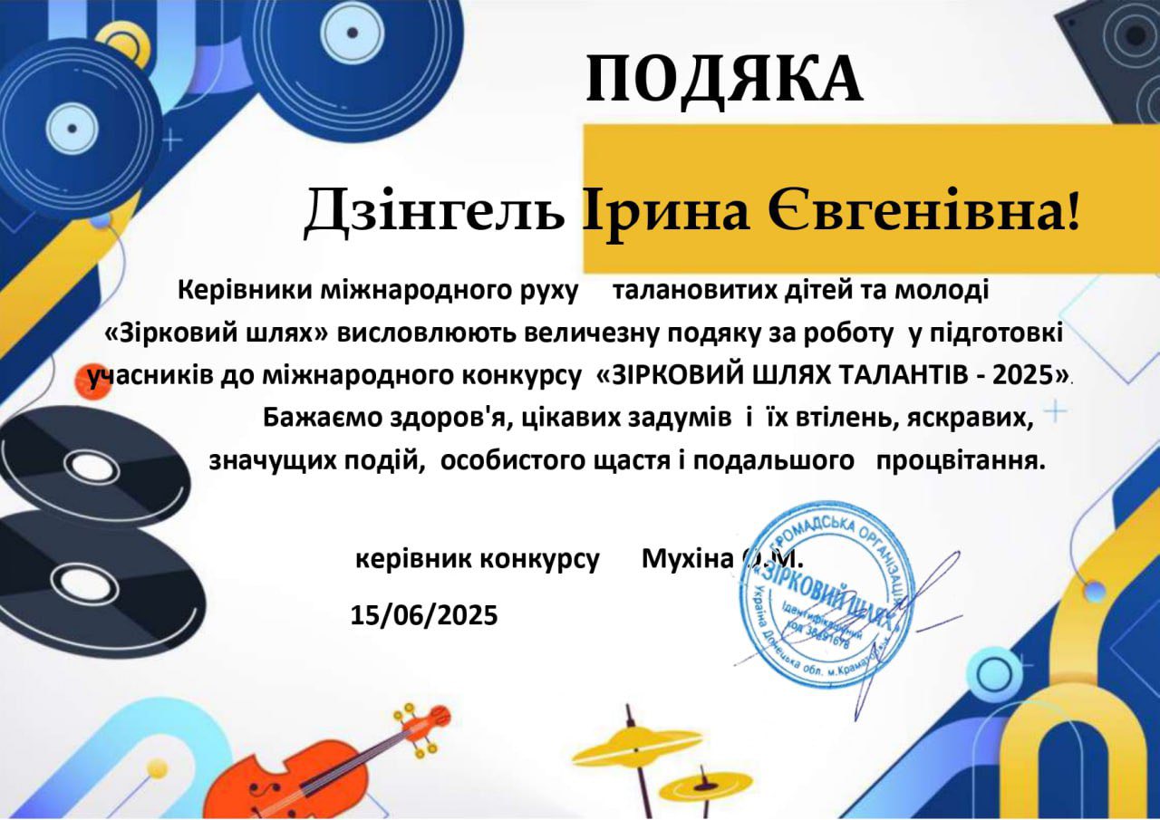 Викладач Ірина Євгенівна Дзінгель відзначена подякою від організаторів конкурсу за підготовку лауреата.