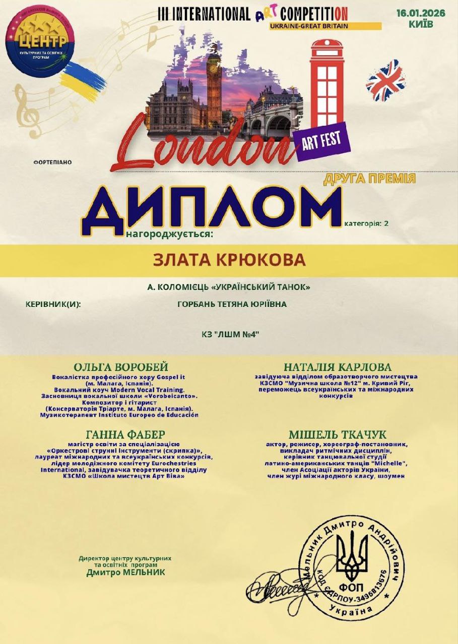 З особливою гордістю у Кам’янській школі мистецтв № 4 повідомили про успіх учениці фортепіанного відділу Злати Крюкової. За результатами конкурсу юну піаністку було нагороджено дипломом ІІ премії за виконання композиції “Український танок” (А. Коломієць).