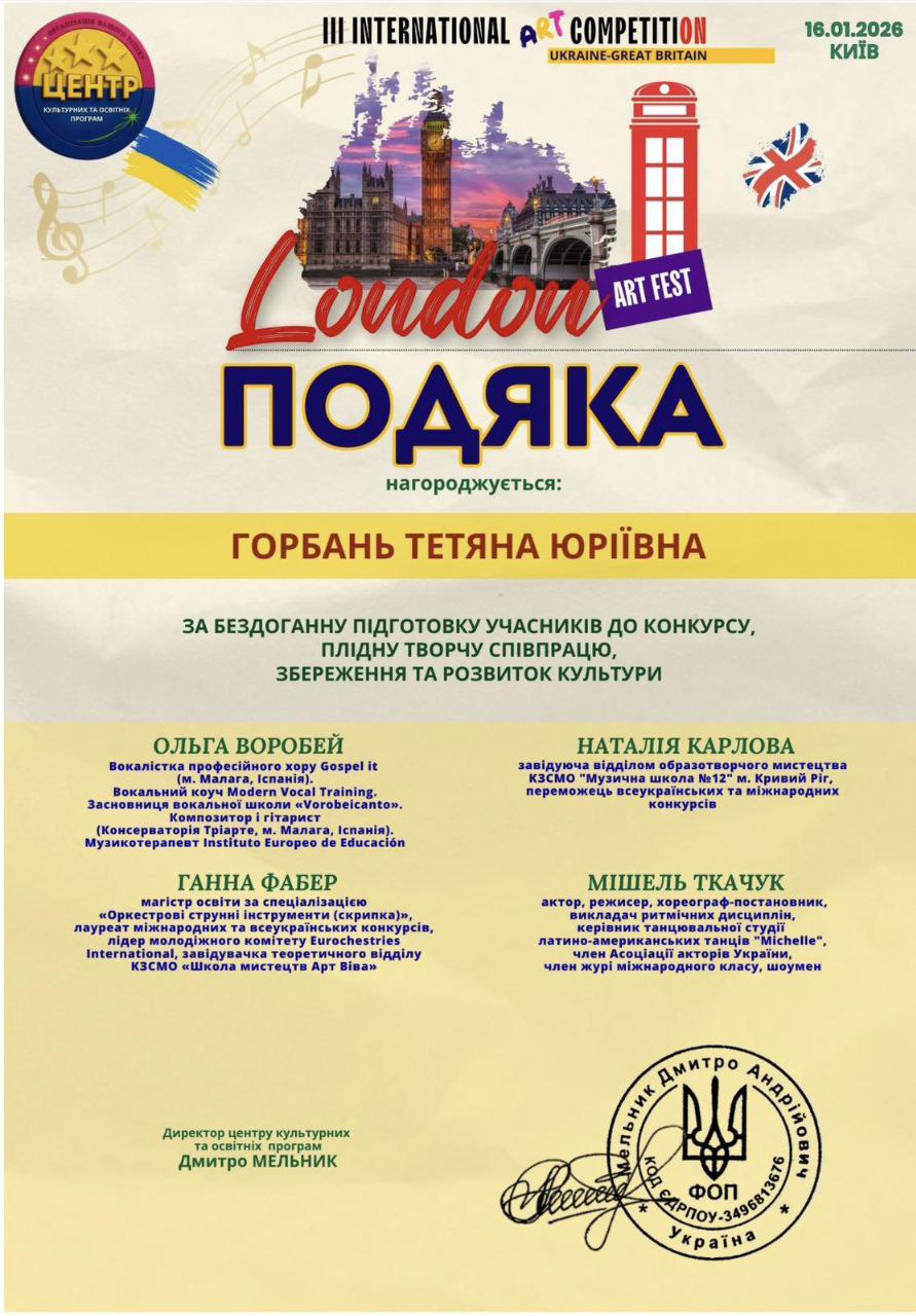 За кожною перемогою талановитої дитини стоїть кропітка праця педагога. Викладач Тетяна Юріївна Горбань отримала від організатора подяку за бездоганну підготовку до конкурсу, плідну творчу співпрацю, збереження та розвиток культури.