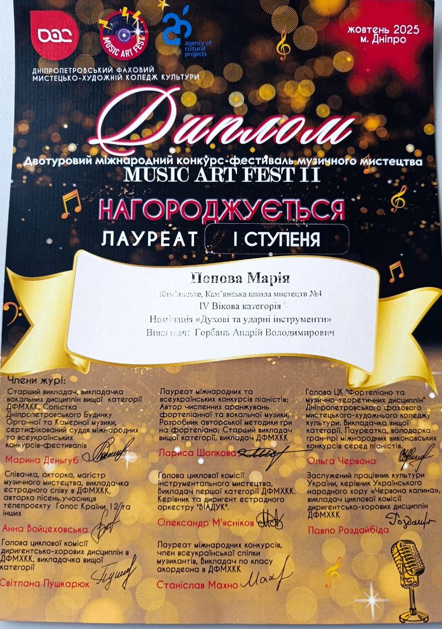 У Кам’янській школі мистецтв №4 пишаються успіхами своїх талановитих учнів. Юна саксофоністка Марія Попова перемогла на двотуровому Міжнародному конкурсі-фестивалі музичного мистецтва Music Art Fest II.
