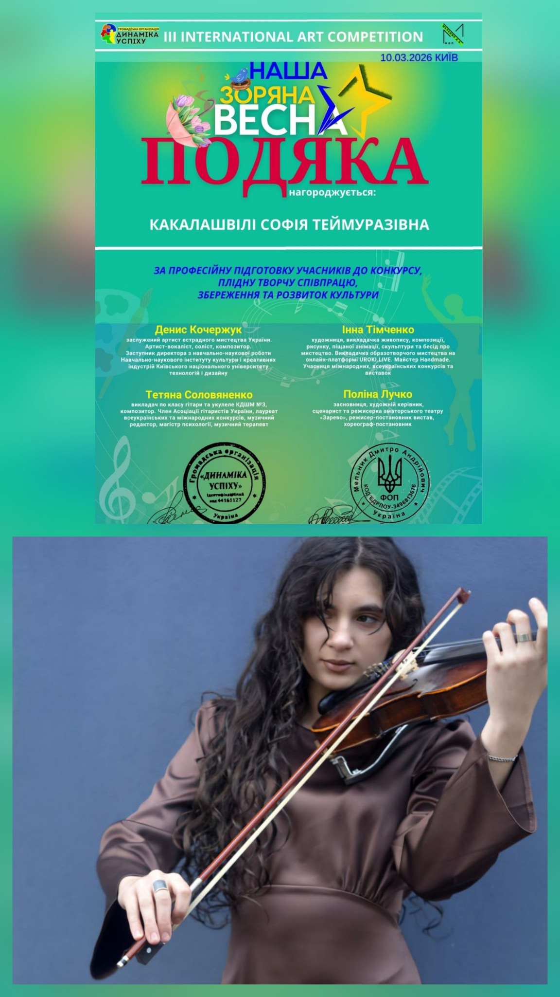 Бажаємо юній скрипальці не зупинятися на досягнутому, сміливо підкорювати нові сцени та дарувати світу красу музики! Нехай ця перемога стане лише першою яскравою сходинкою до великого творчого майбутнього, сповненого натхнення, нових звершень і гучних аплодисментів!