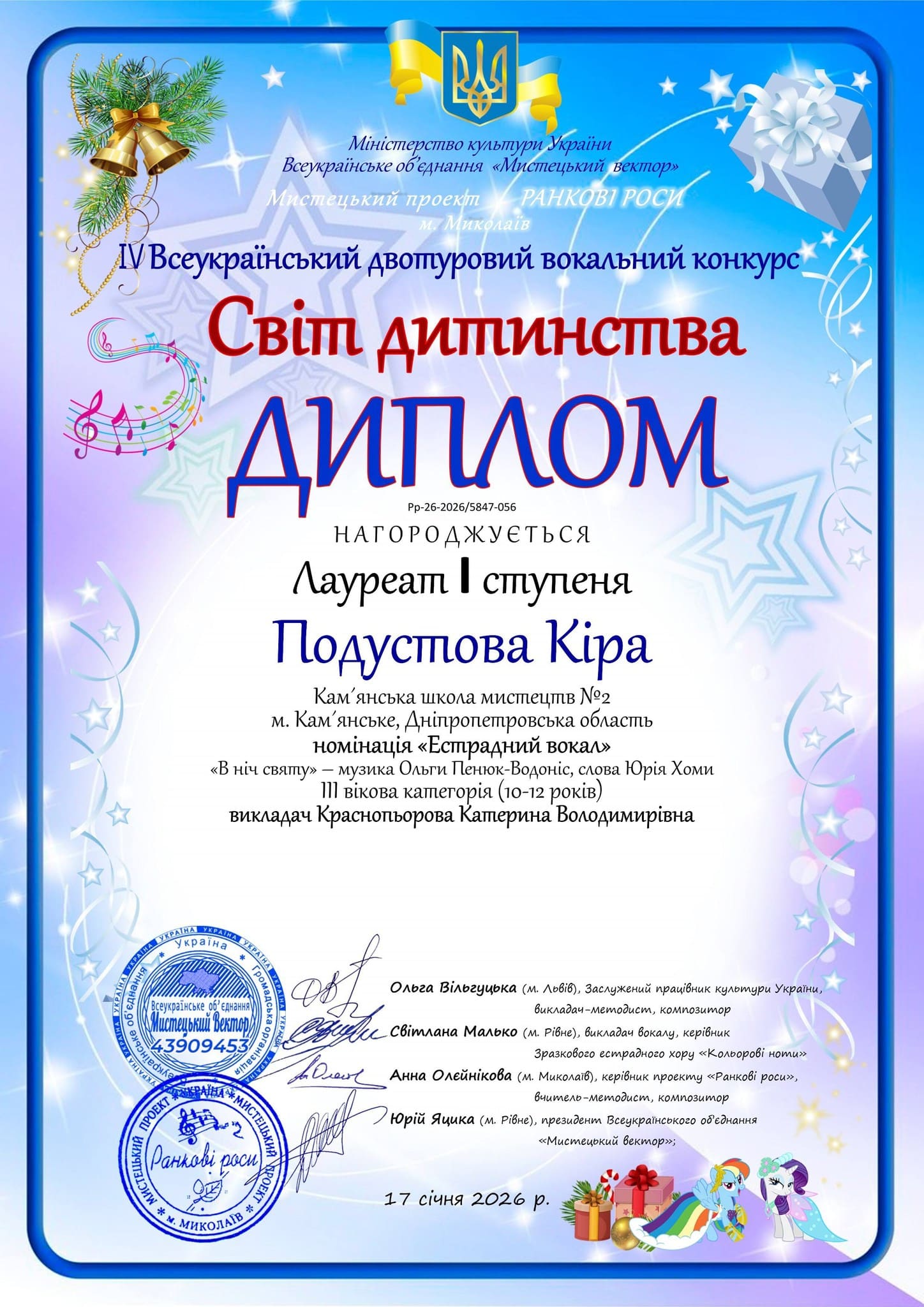 Кам’янську школу мистецтв № 2 у цьому творчому змаганні представила учениця класу сольного співу Кіра Подустова. За виконання пісні «В ніч святу» (музика Ольги Пенюк-Водоніс, слова Юрія Хоми) дівчинку нагороджено дипломом лауреата І ступеня (номінація «Естрадний вокал»).