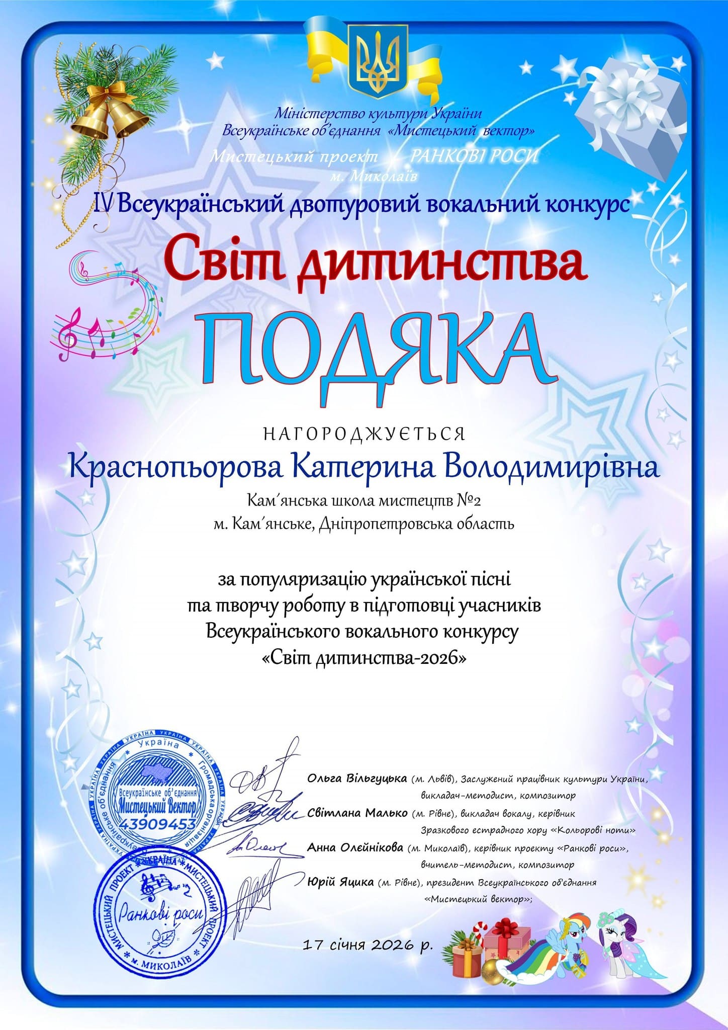 Викладач Катерина Краснопьорова отримала подяку за популяризацію української пісні та творчу роботу в підготовці учасниці вокального конкурсу.