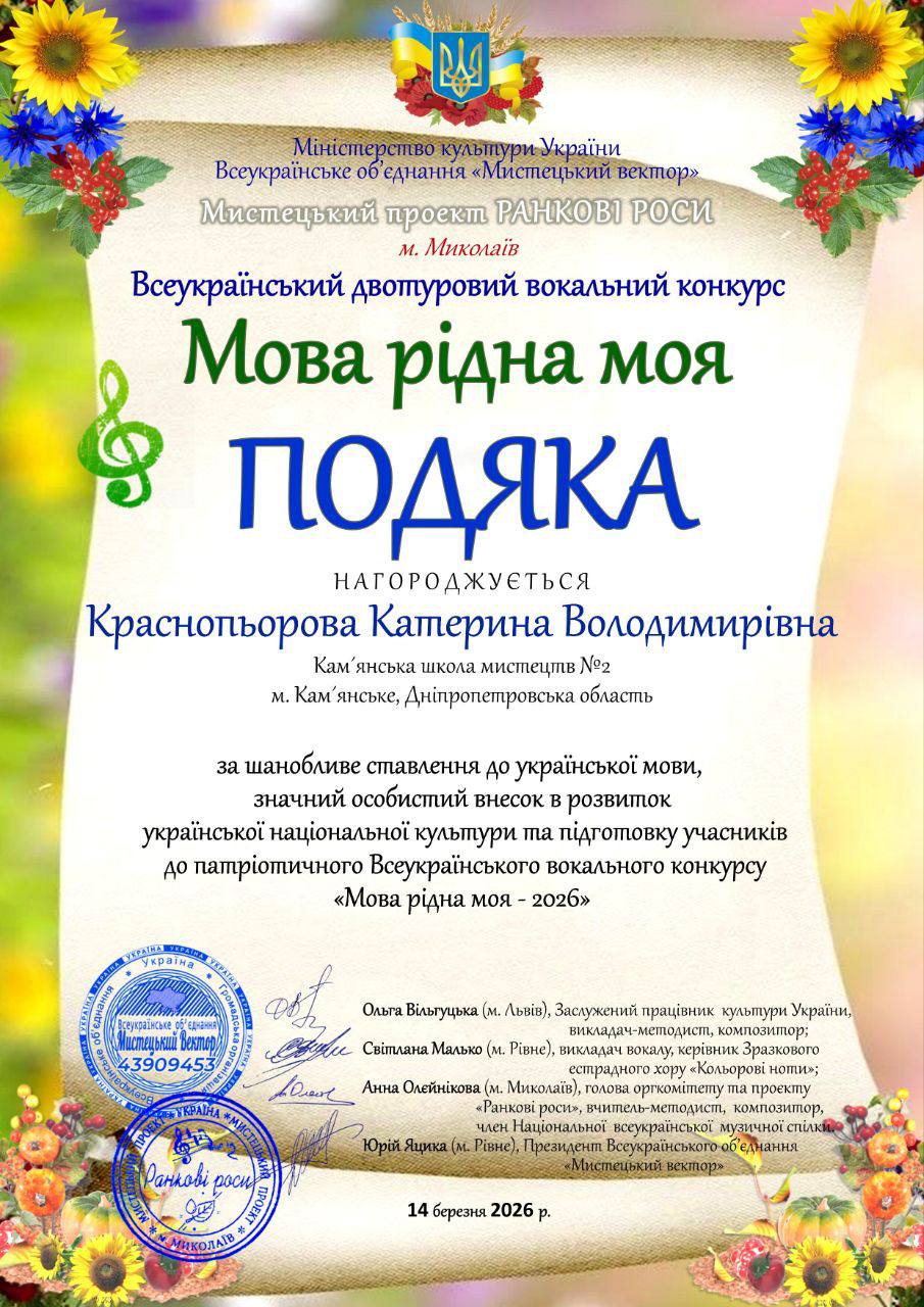 Дівчинка взяла участь у Всеукраїнському двотуровому дистанційному конкурсі вокалістів і читців «Мова рідна моя – 2026», що відбувся 14 березня (Миколаїв). За зворушливе виконання пісні «Квітка-душа» юну вокалістку було нагороджено дипломом лауреата І ступеня.
