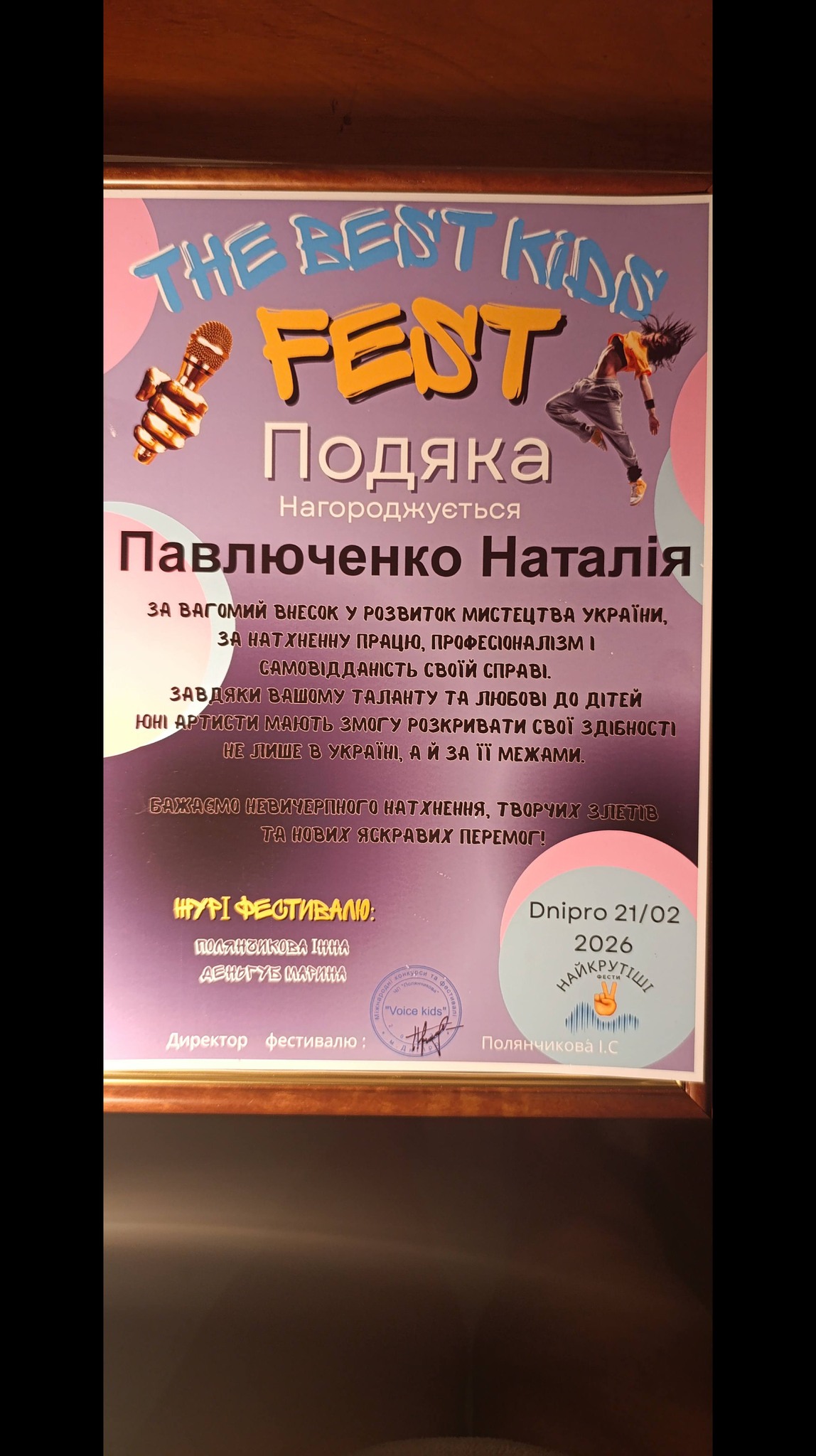 Організатори відзначили керівницю колективу Наталію Павлюченко подякою за вагомий внесок у розвиток мистецтва України, за натхненну працю, професіоналізм і самовідданість своїй справі.