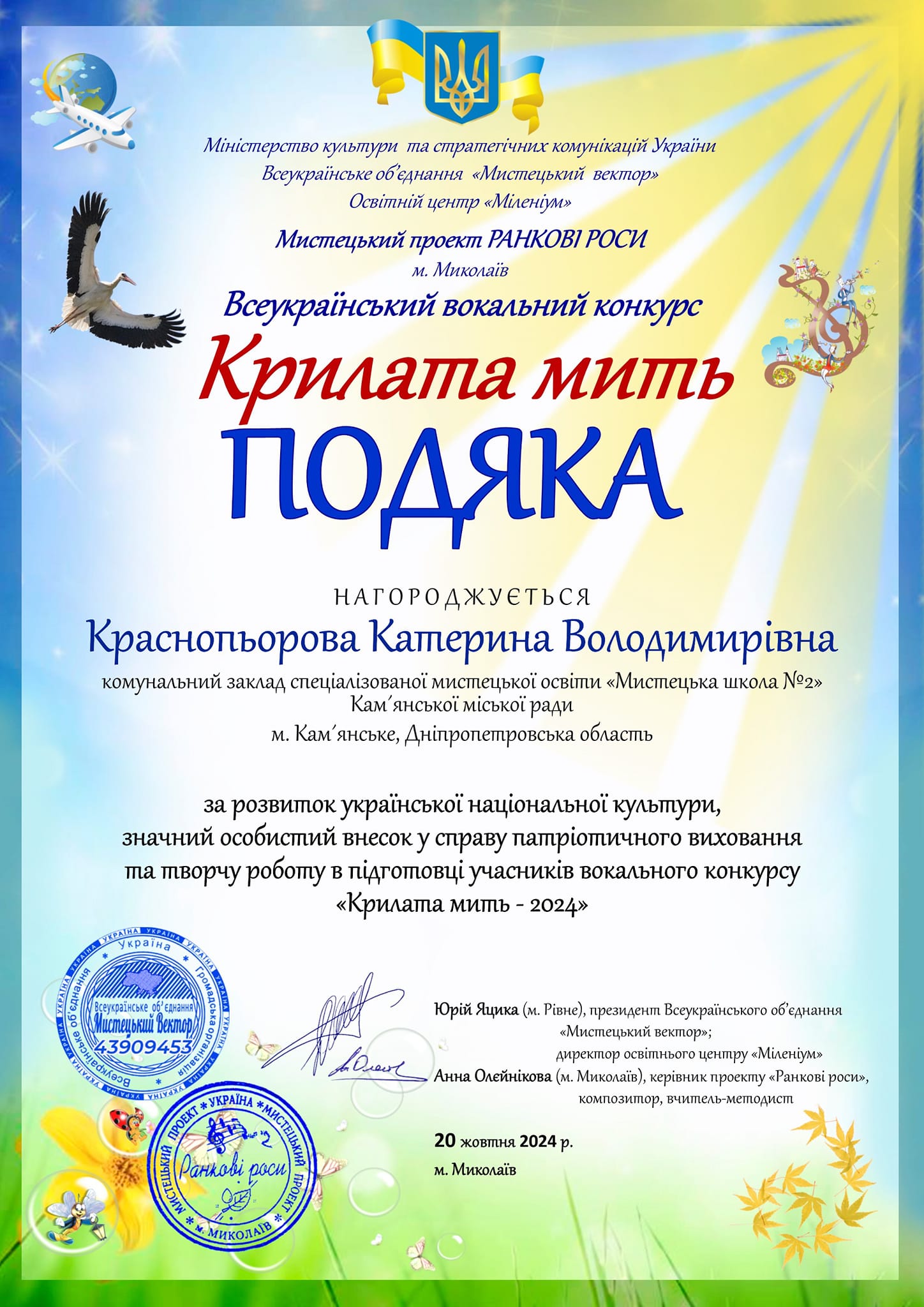 За виконання пісні “Лети” українського гурту “Vivienne Mort” схвальні відгуки жюрі отримала Ірина Юрченко. Дівчинка посіла перше місце. Викладач Катерина Краснопьорова відзначена подякою за розвиток української національної культури, значний особистий внесок у справу патріотичного виховання та творчу роботу в підготовці учасників вокального конкурсу “Крилата мить – 2024”.