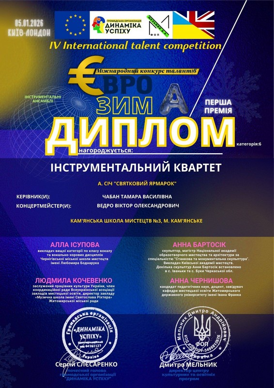Яскравою подією сезону став IV Міжнародний конкурс талантів «ЄВРО ЗИМА» (Київ-Лондон), що відбувся 5 січня. Зимові чари відчувалися в кожному виступі, поєднуючи в собі ніжність і силу, спогади та мрії. Серед переможців конкурсу — талановиті учні Кам’янської школи мистецтв № 3. Інструментальний квартет класу акордеона було удостоєно I премії. Юних музикантів відзначили заслуженими нагородами.