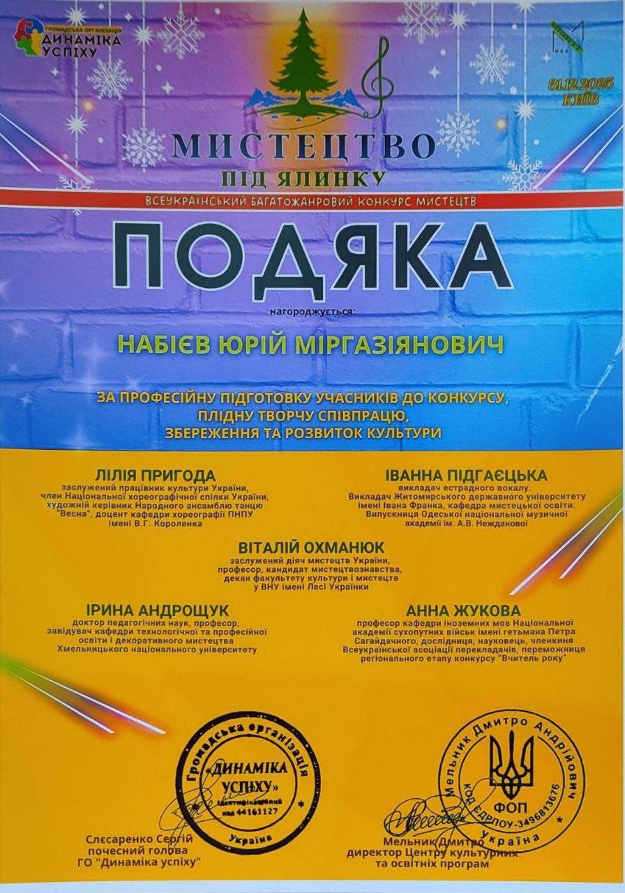 Керівник Юрій Набієв отримав подяку за професійну підготовку учасників до конкурсу, плідну творчу співпрацю, збереження та розвиток культури.
