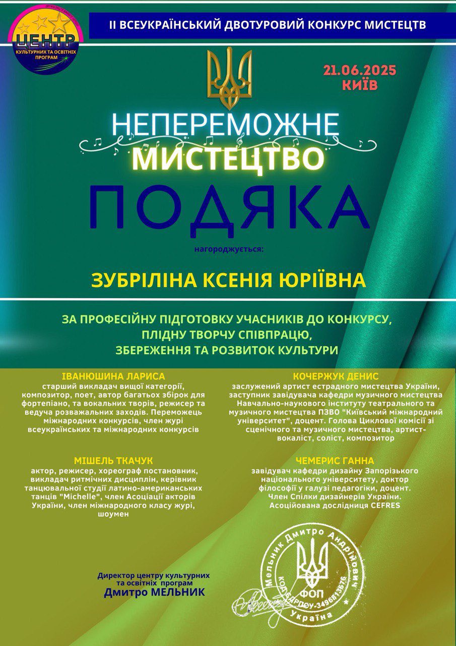 Викладача Ксенію Зубріліну нагороджено подякою за професійну підготовку учасників до конкурсу, плідну творчу співпрацю, збереження та розвиток культури.