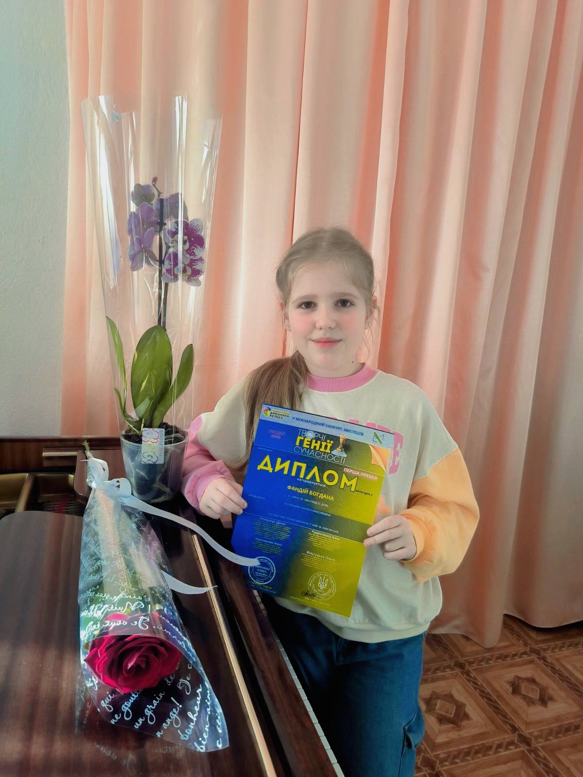 Відзначимо також успіх Богдани Фандій. Учениця фортепіанного відділу перемогла на ІІ Міжнародному конкурсі мистецтв “Творчі генії сучасності“, який проводився в Києві 21 лютого. Організатором виступила ГО “Динаміка успіху”.