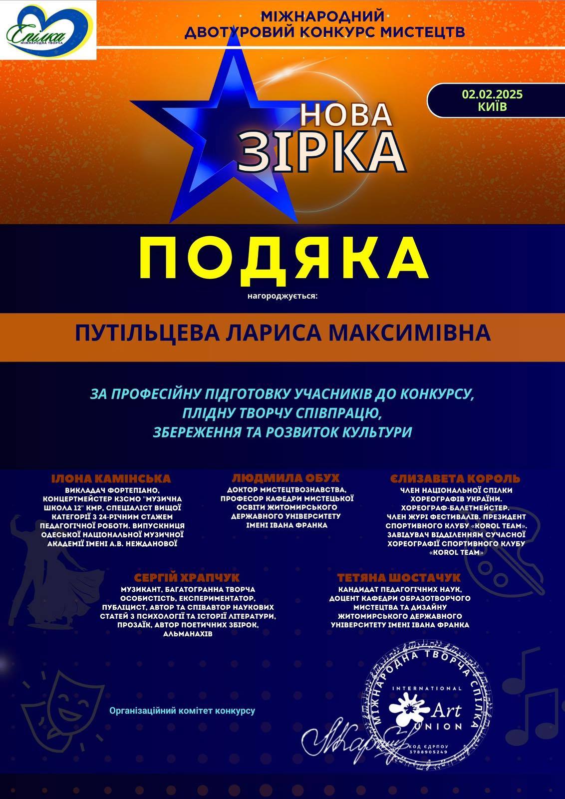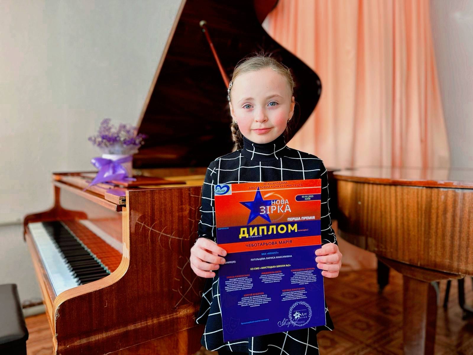 У Києві 2 лютого відбувся Міжнародний багатожанровий двотуровий фестиваль-конкурс мистецтв “Нова зірка – 2025“. Його проводила міжнародна творча спілка “Art Union” за підтримки Міністерства культури та стратегічних комунікацій та МОН України. Заклад гідно представила Марія Чеботарьова. За виконання “Менуету” І. С. Баха юній піаністці присудили першу премію.