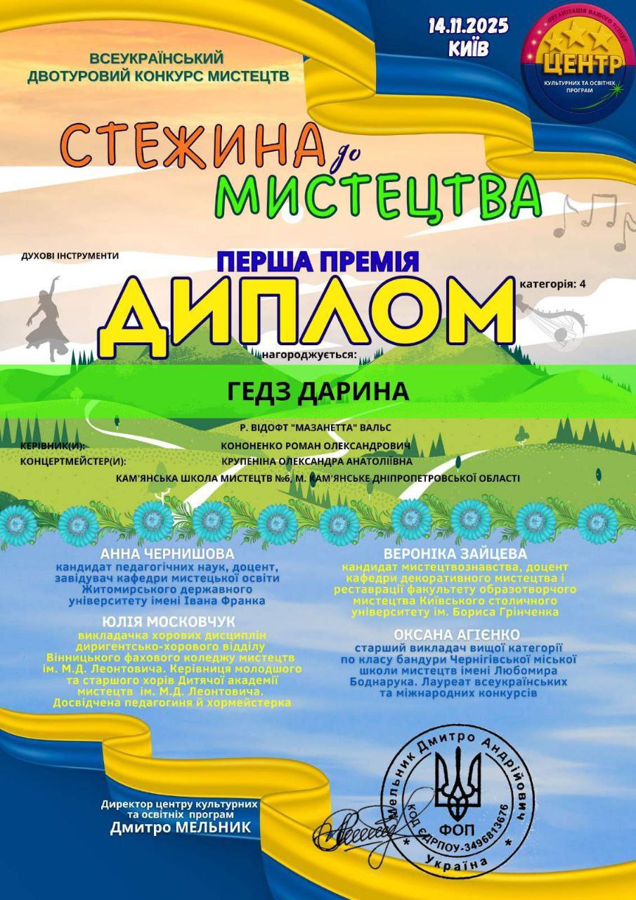 Дарина Гедз – диплом І ступеня. Юна саксофоністка здобула впевнену перемогу на Всеукраїнському двотуровому конкурсі мистецтв “Стежина до мистецтва“. Його організував Центр культурних та освітніх програм. Конкурс став випробуванням майстерності, адже кожен виступ на ньому – це крок на унікальному творчому шляху. Дарина вразила журі виконанням твору “Мазанетта” Р. Відофта.