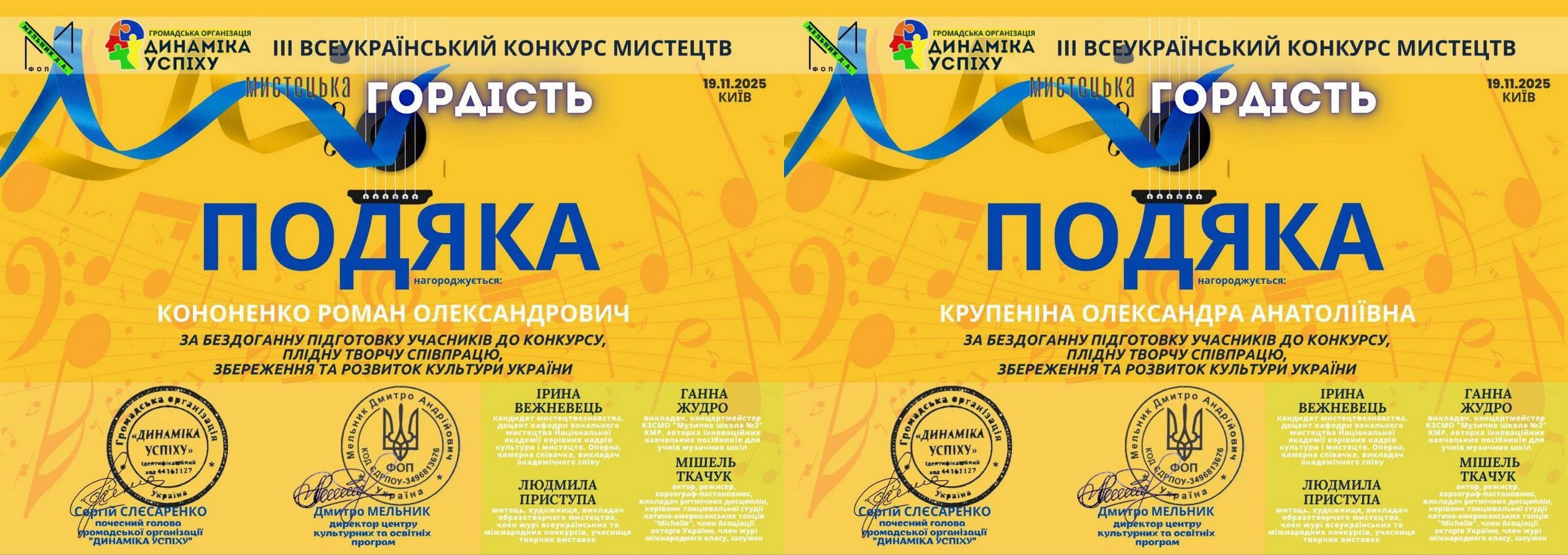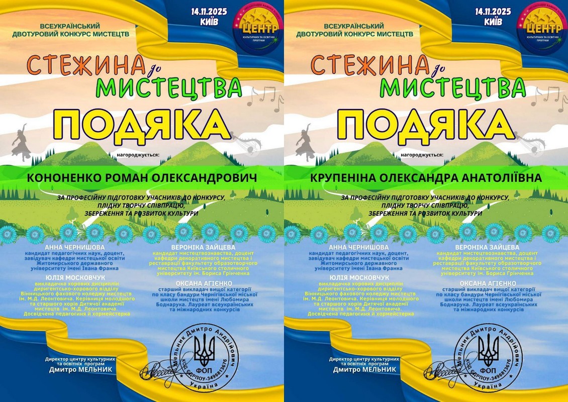 Викладач Роман Кононенко та концертмейстер Олександра Крупеніна отримала від організаторів конкурсів подяки за бездоганну підготовку учениць, плідну творчу співпрацю, збереження та розвиток культури.