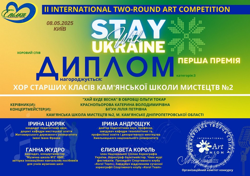 У Києві 8 травня відбувся II Міжнародний дистанційний конкурс мистецтв STAY WITH UKRAINE. Ця подія стала справжнім святом для всіх, хто вірить у непереможну силу мистецтва, його здатність об’єднувати та дарувати надію навіть у найскладніші часи. Конкурс, який організувала міжнародна творча спілка Art Union, підкреслив непохитність українського духу та єдність, яку мистецтво здатне творити.