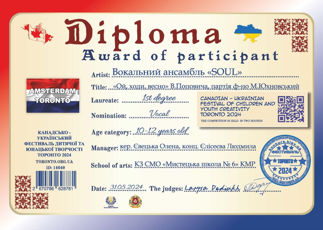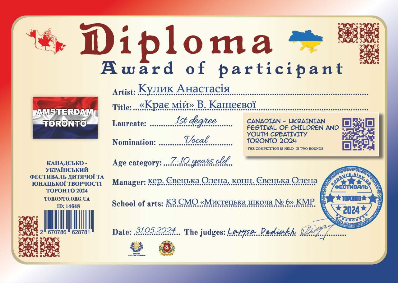 Діти взяли участь у Міжнародному канадсько-українському фестивалі дитячої та юнацької творчості “Торонто-2024”. Вихованці закладу показали чудові результати вномінації “Вокал”. Дипломом першого ступеня були нагороджені: