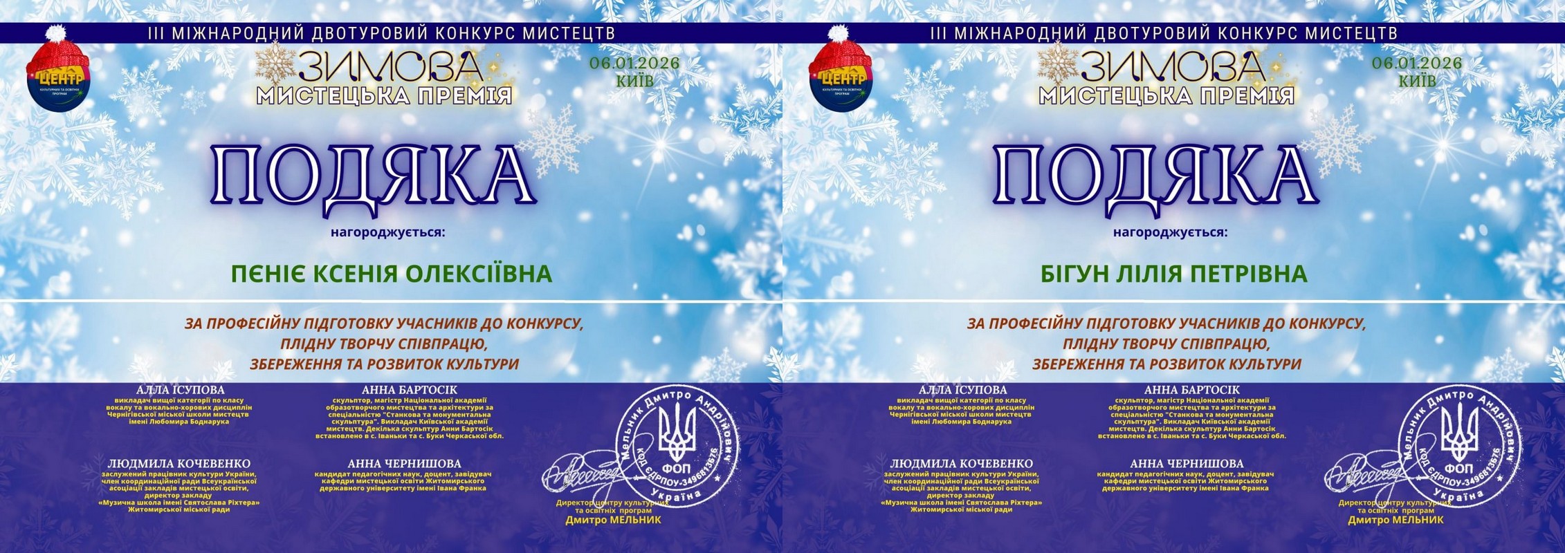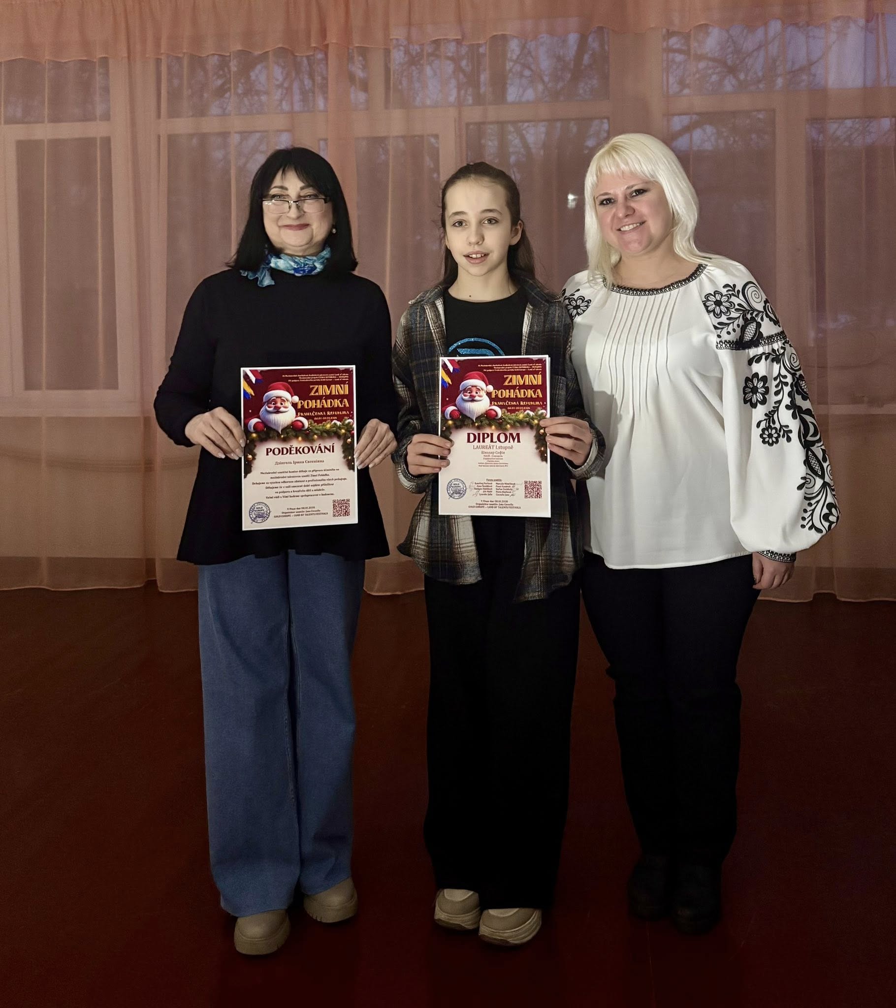 З 2 по 8 січня у дистанційному форматі проводився Міжнародний благодійний двотуровий конкурс мистецтв «Зимова казка – 2026» (Україна – Чехія), організований фестивальним порталом Land of Talents – Gold Europe Festivals. Учениця ІІ класу відділення образотворчого мистецтва Софія Школяр отримала диплом лауреата І ступеня за творчу роботу «Чарівна зима». Викладач Ірина Дзінгель була відзначена подякою організаторів.