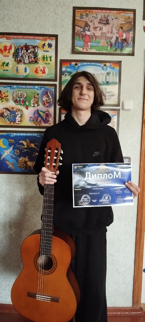 Учень класу гітари Назар Єрмаков посів перше місце на Міжнародному двотуровому конкурсі мистецтв “VIRTUOSO” (Київ) від громадської організації “Динаміка успіху”.