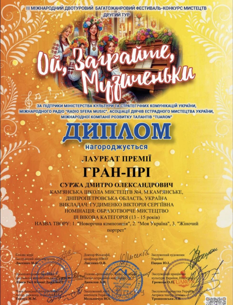 Учні художнього відділення взяли участь у ІІІ Міжнародному двотуровому багатожанровому конкурсі мистецтв “Ой, заграйте, музиченьки” та стали переможцями: