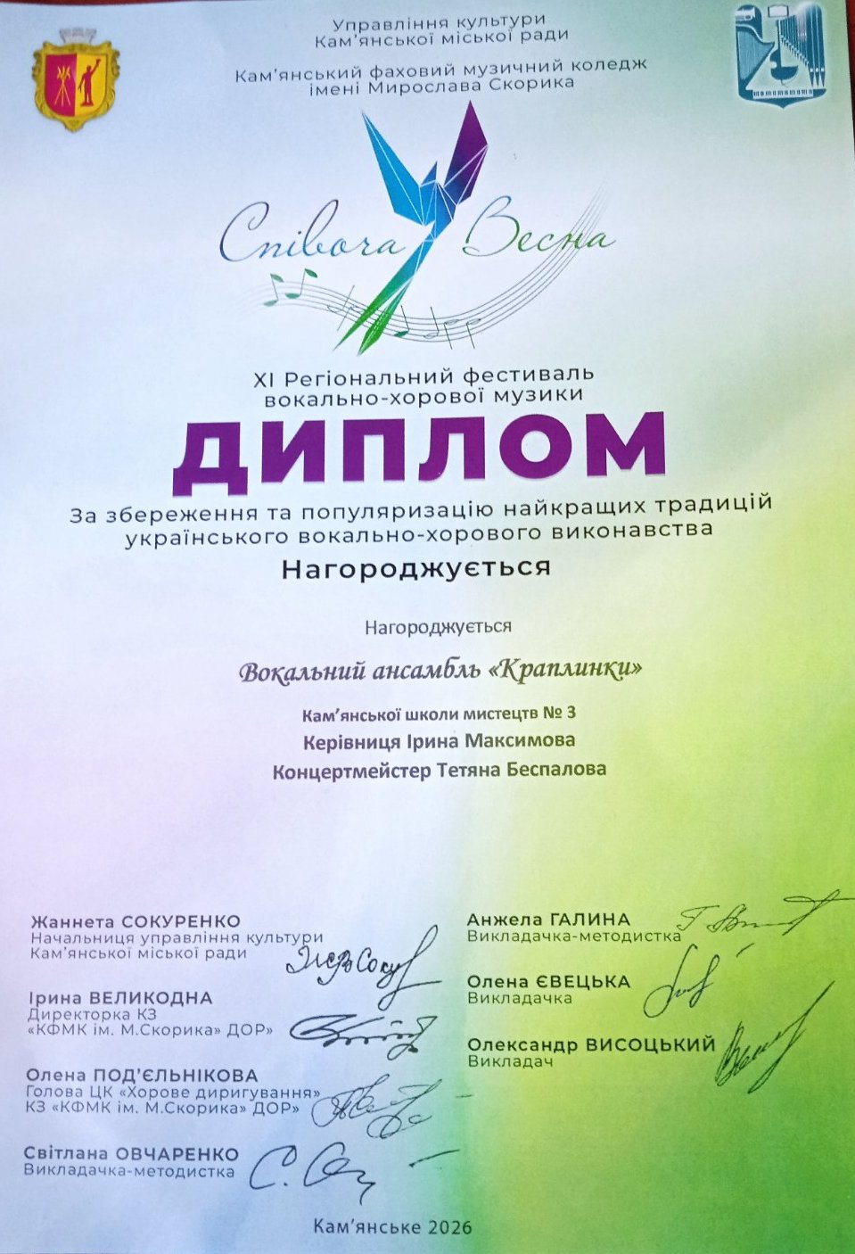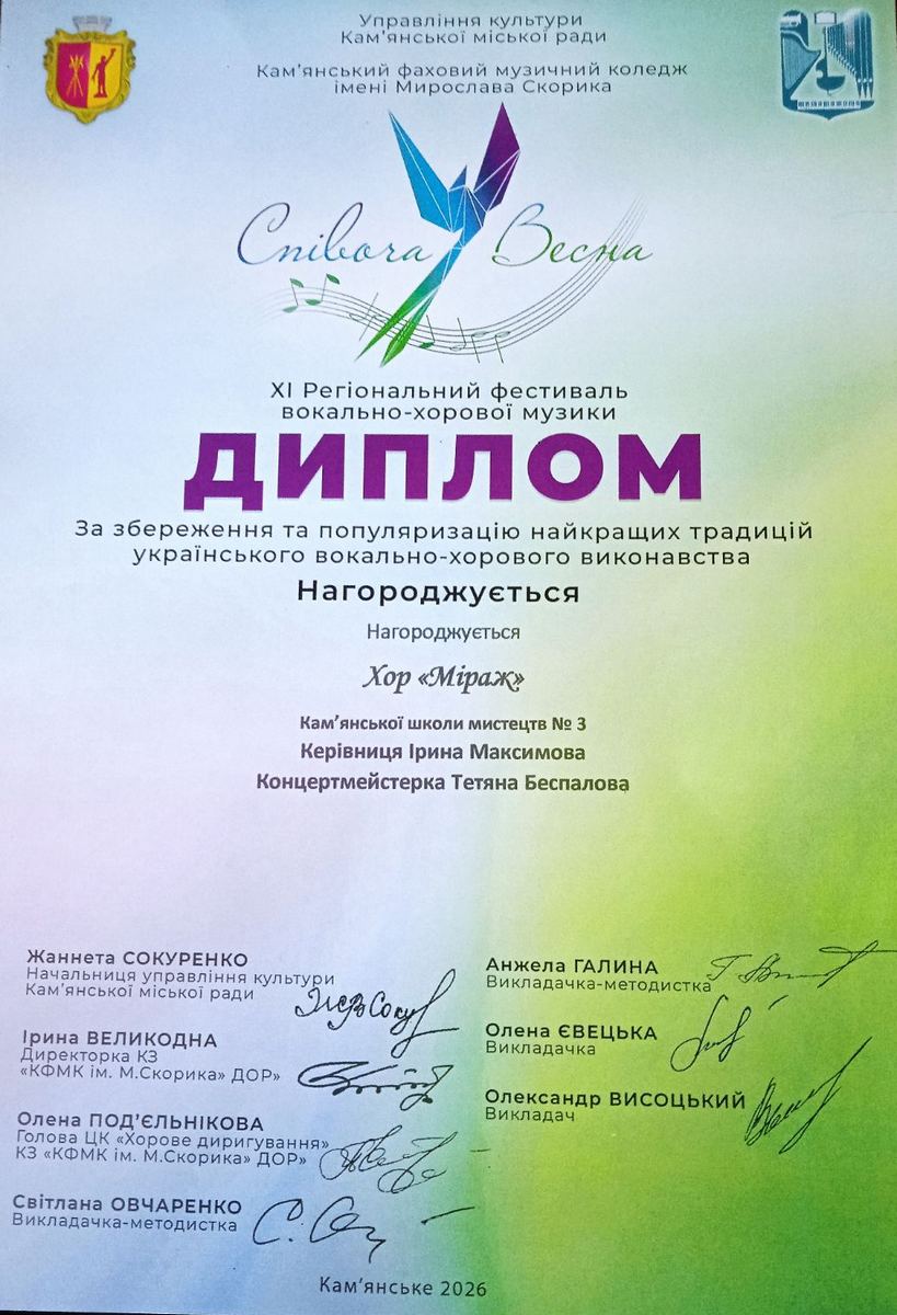 Регіональний фестиваль вокально-хорової музики «Співоча весна» відбувся 21 квітня на базі музичного коледжу імені М. Скорика. Мистецьку школу №3 представляли два колективи: хор «Міраж» та вокальний ансамбль «Крапельки». Музичний супровід забезпечила концертмейстер Тетяна Беспалова.