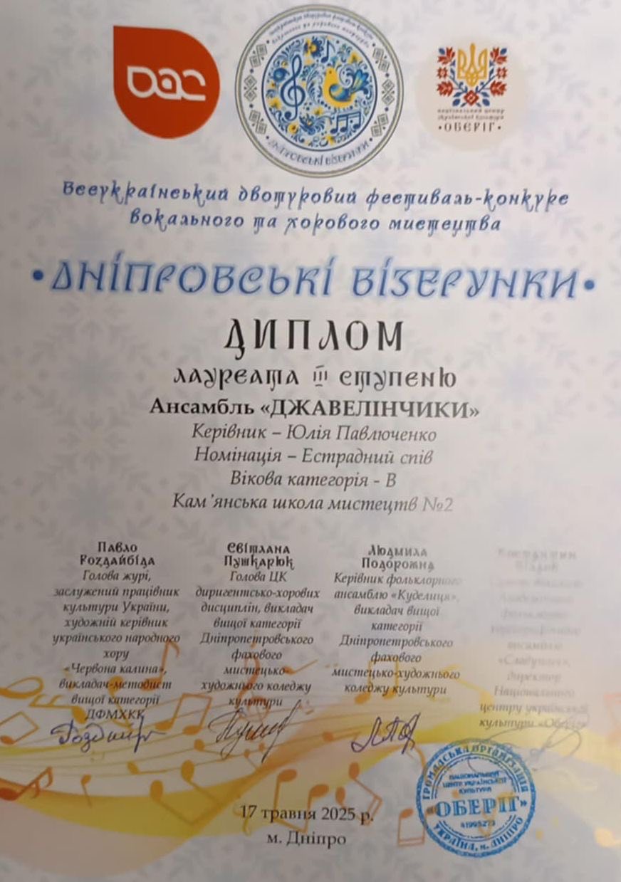 Кам’янчани продемонстрували відмінні результати. Вокальний ансамбль “Джавелінчики”  запалив концертну залу своєю енергією, завоювавши диплом лауреата ІІІ ступеня.