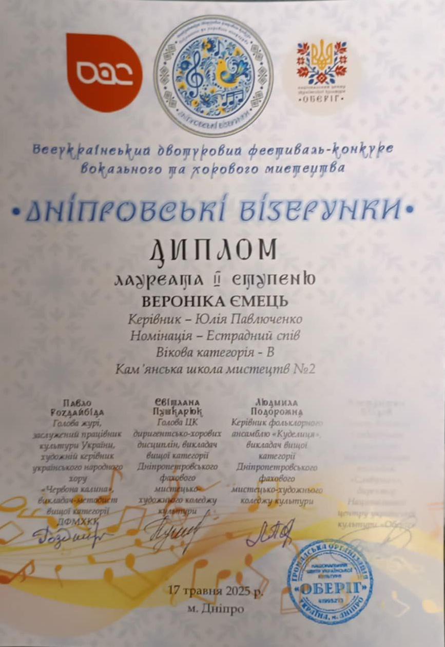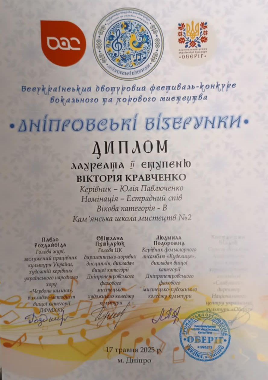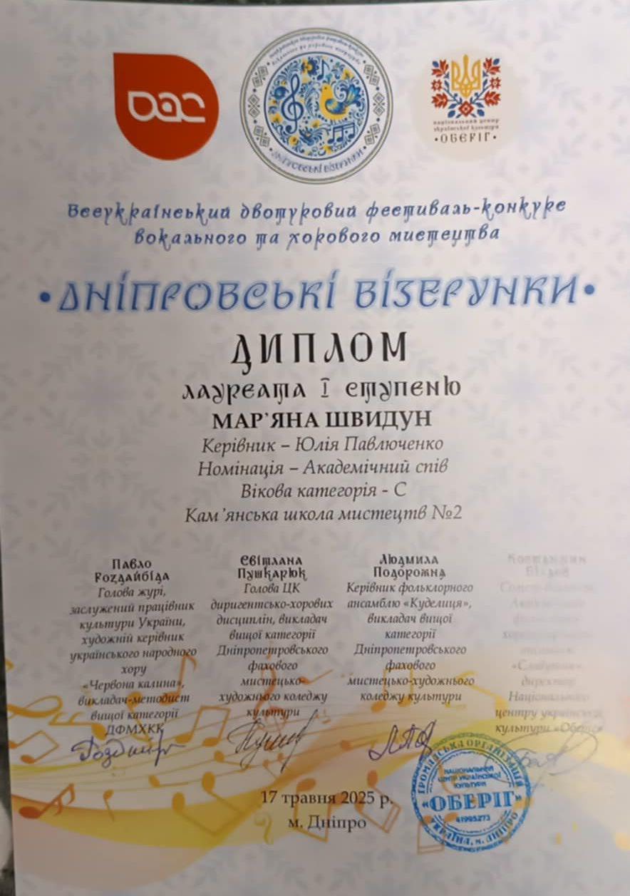 Учениці сольного співу класу викладача Юлії Олексіївни Павлюченко також блискуче виступили та отримали такі нагороди: