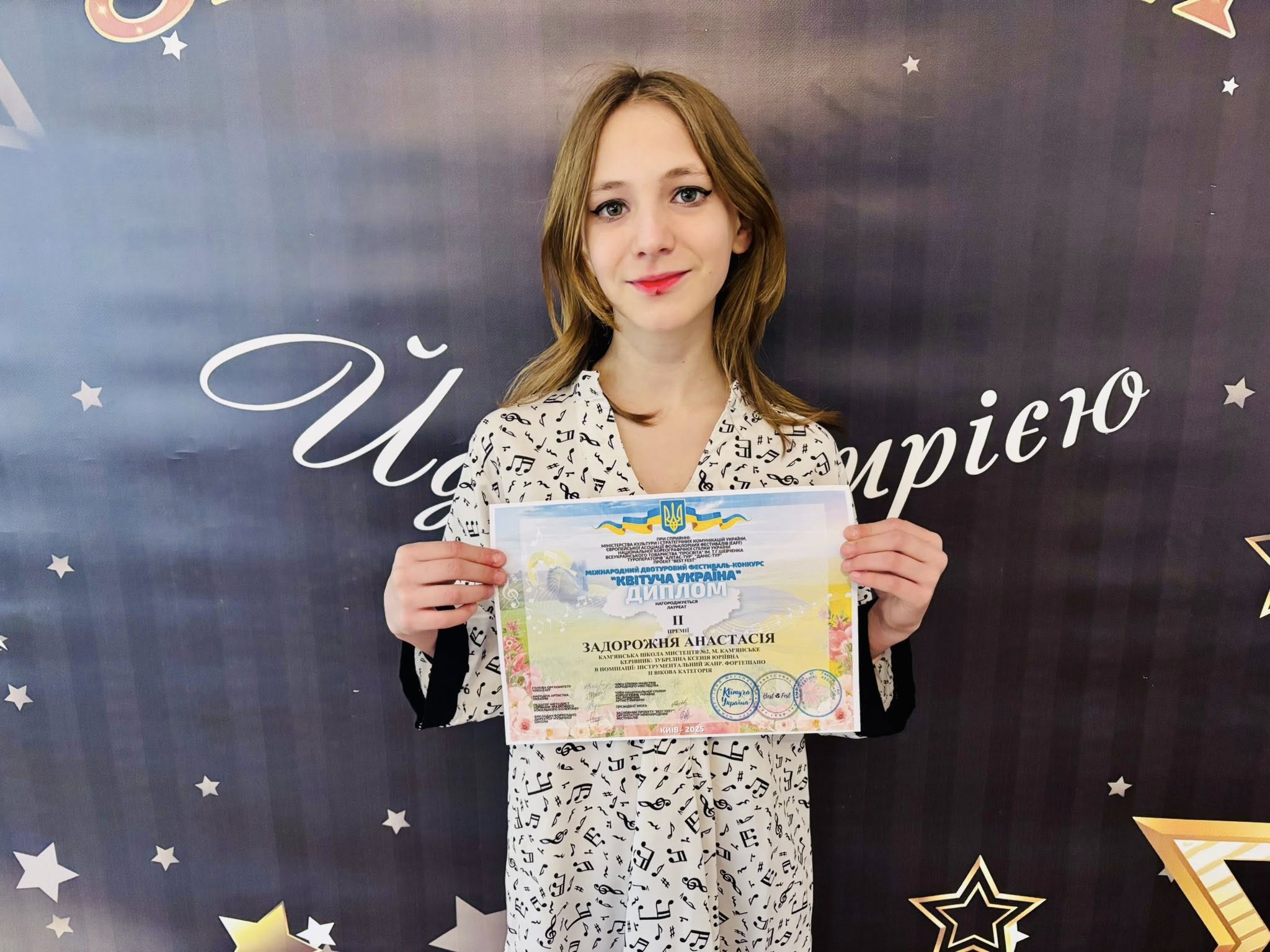 Відзначимо також успіх юної піаністки Анастасії Задорожньої. Вона отримала диплом лауреата II премії за участь у Міжнародному двотуровому фестивалі-конкурсі “Квітуча Україна“. Його підсумки було підбито 14 квітня у Києві. Конкурс відбувся за сприяння МКСК, Київського державного коледжу туризму, Всеукраїнського товариства “Просвіта” ім. Тараса Шевченка та Європейської асоціації фольклорних фестивалів (EAFF).