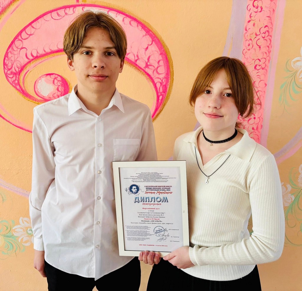 Учні фортепіанного відділу викладача Ксенії Зубріліної взяли участь в номінації “Ансамбль”. Фортепіанний дует у складі Єгора та Дар’ї Головкових посів третє місце. Послухайте, як чудово грають музиканти!
