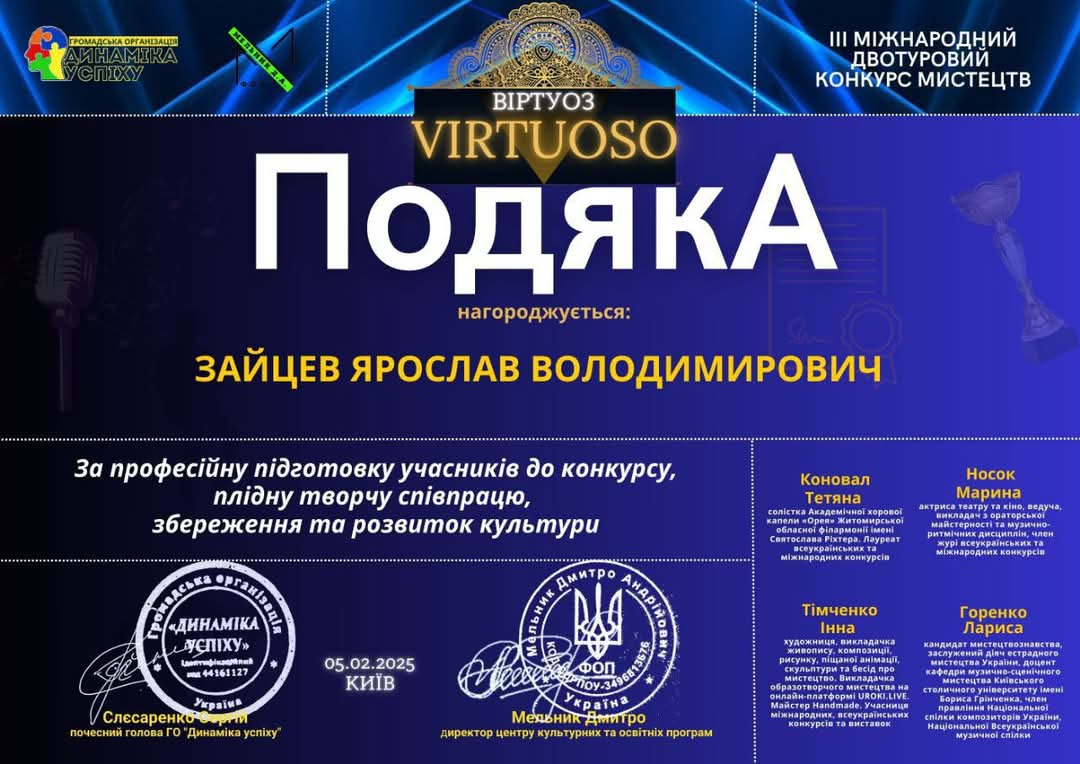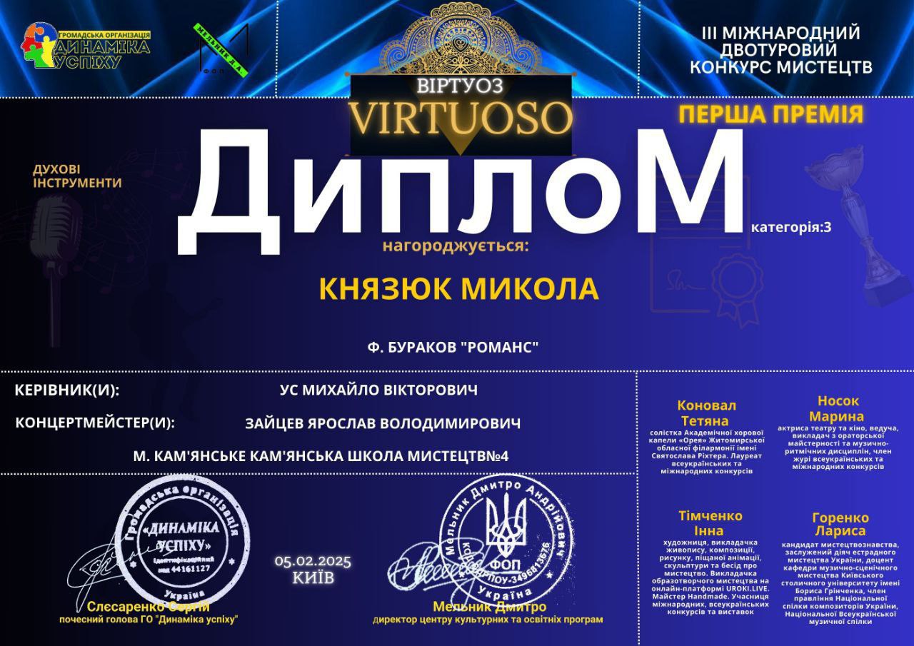Вихованець школи також віртуозно виконав на трубі композицію “Романс” Ф. Буракова. Цей музичний номер справив приємне враження на суддів ІІІ Міжнародного двотурового конкурсу мистецтв “VIRTUOSO” (Київ), який відбувся 5 лютого. Організатором виступила ГО “Динаміка успіху”. За підсумками прослуховування інструменталіст став одним із найкращих.