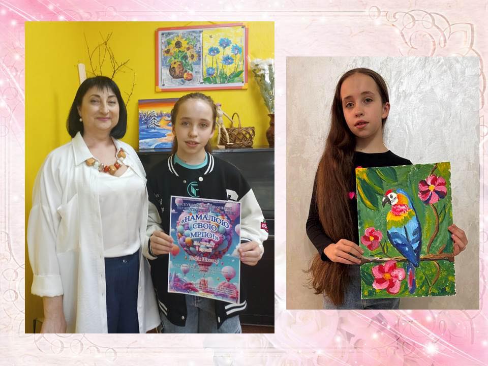 Учениці відділення образотворчого мистецтва класу викладача Ірини Євгенівни Дзінгель 15 квітня взяли участь у Всеукраїнському конкурсі образотворчого мистецтва “Намалюю свою мрію”. Цей мистецький захід проходив дистанційно на базі Херсонського державного будинку художньої творчості. Дівчатка показали відмінні результати: