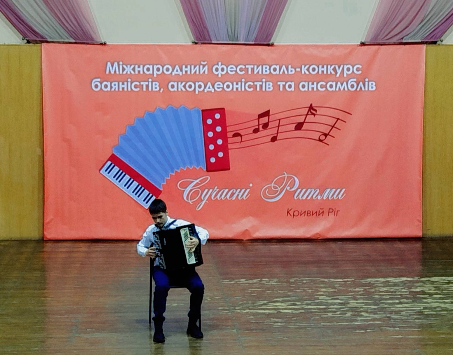 У Кривому Розі 26 квітня провели масштабну подію для акордеоністів, баяністів та ансамблів – гала-концерту та церемонію нагородження переможців Міжнародного фестивалю-конкурсу “Сучасні ритми“. Єдиним представником Кам’янського став випускник оркестрового відділу Єгор Реш (викладач Олена Михайлівна Зінченко). Серед майже сотні учасників з Молдови, Швеції та 18 областей України Єгор посів почесне третє місце у своїй віковій категорії. Гала-концерт відбувся в криворізькій музичній школі №4 за участі поважного журі. Яскравим фіналом концерту вечора став виступ Володимира Мурзи – голови журі конкурсу, народного артиста України, професора, завідувача кафедри народних інструментів Одеської національної академії музики ім. А. В. Нежданової, члена Національної всеукраїнської музичної спілки.
