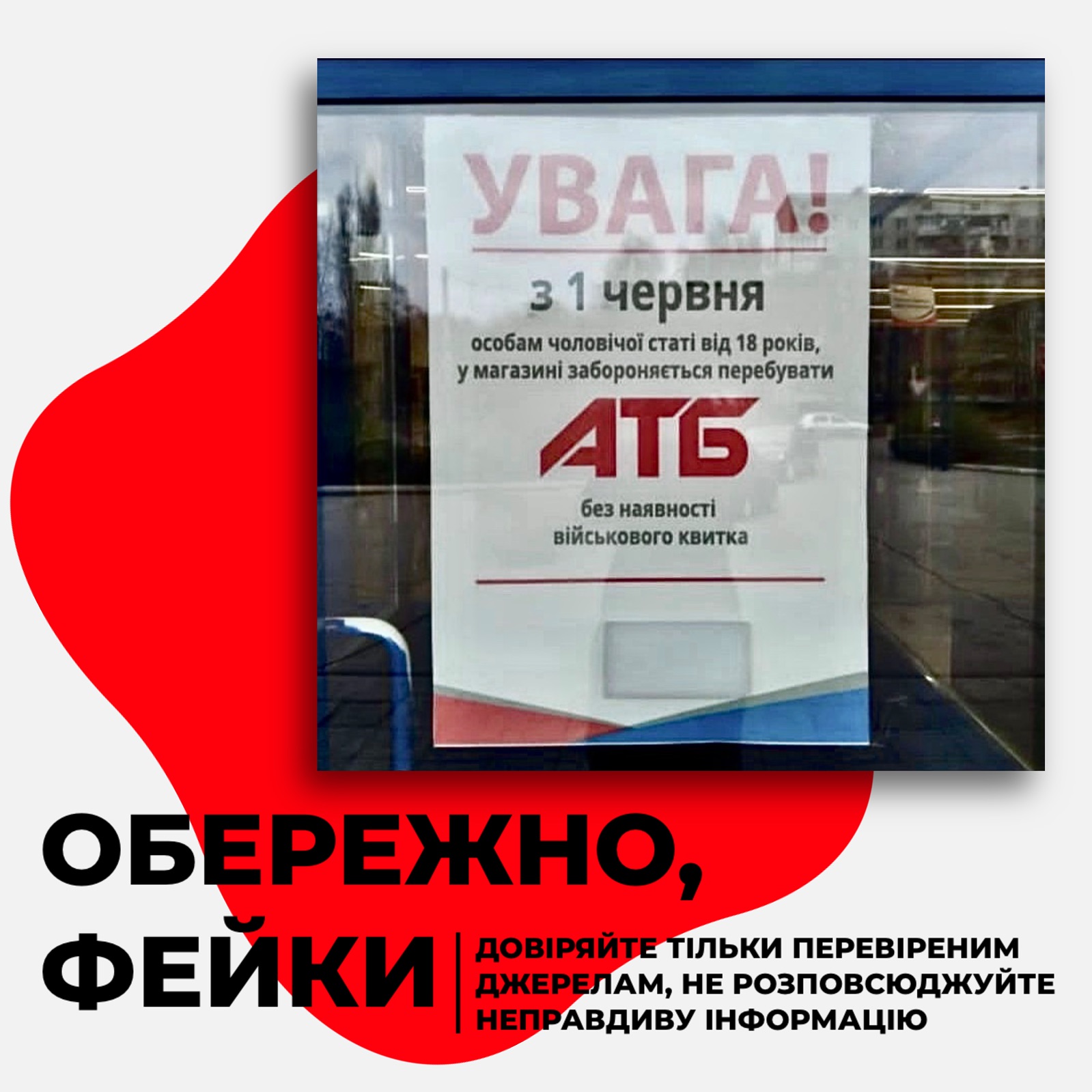 В інтернеті поширили фото оголошення про те, що нібито з 1 червня чоловікам від 18 років без військового квитка буде заборонено перебувати в магазинах “АТБ”.