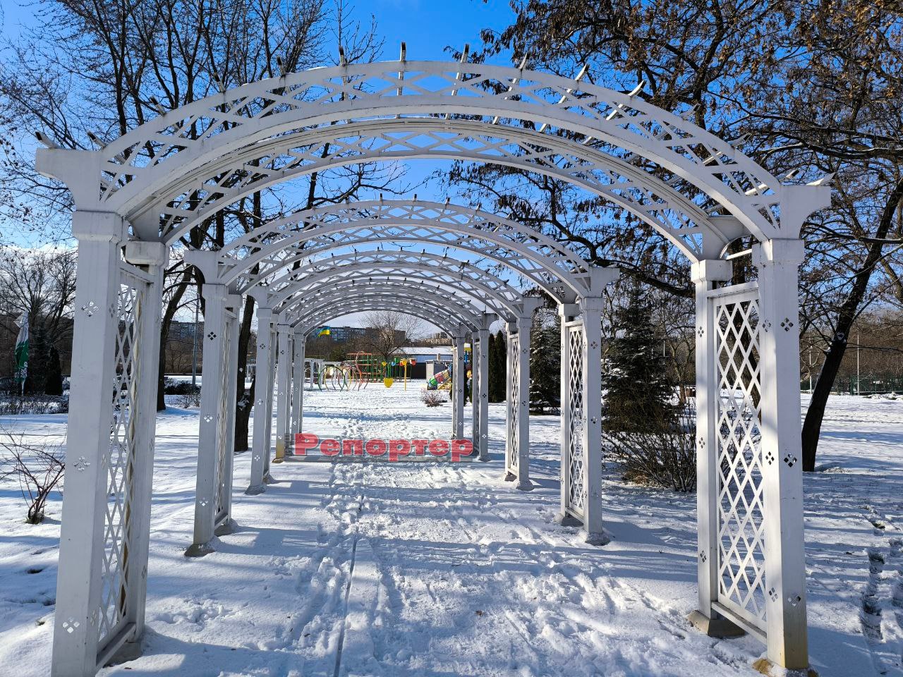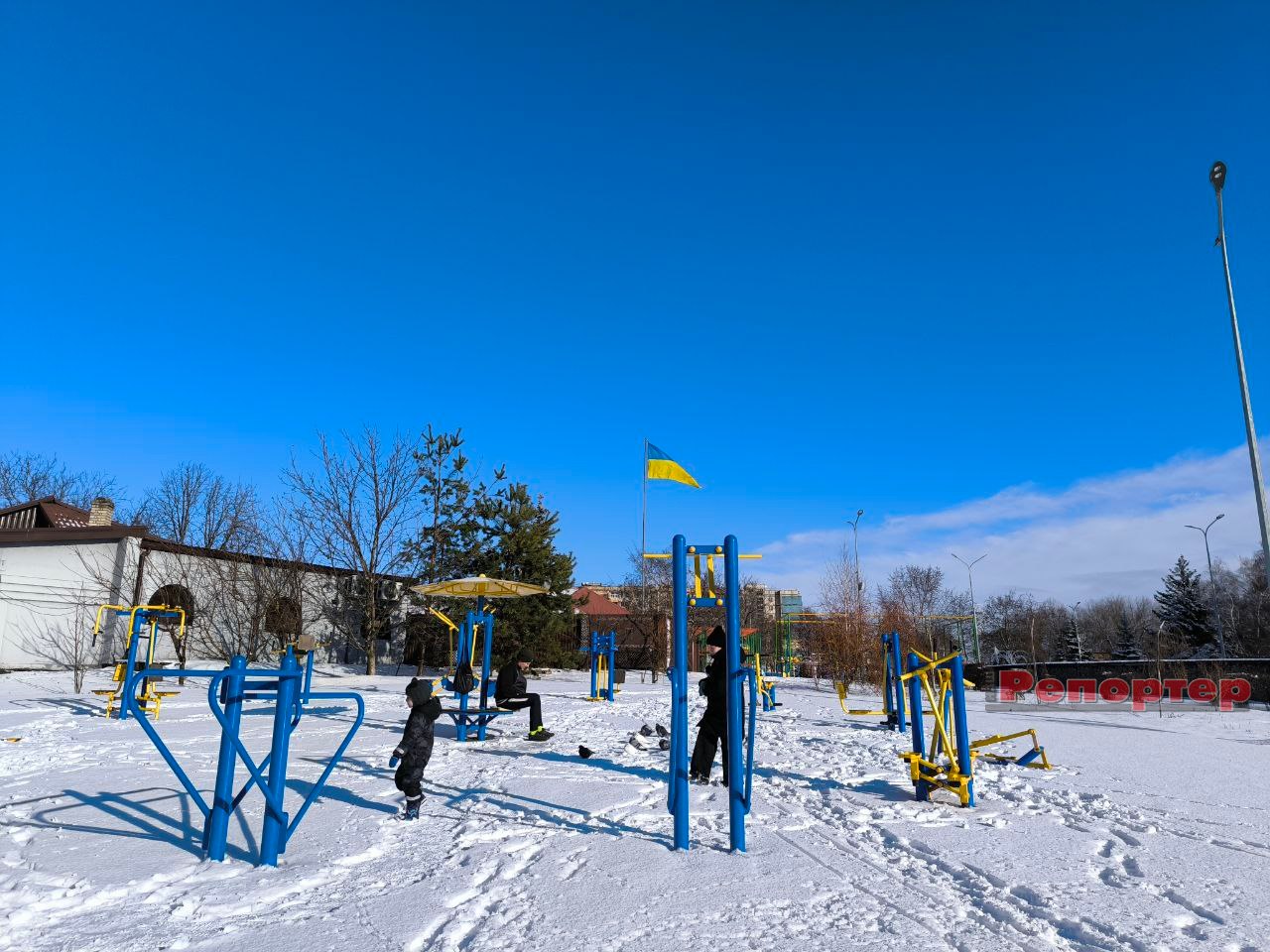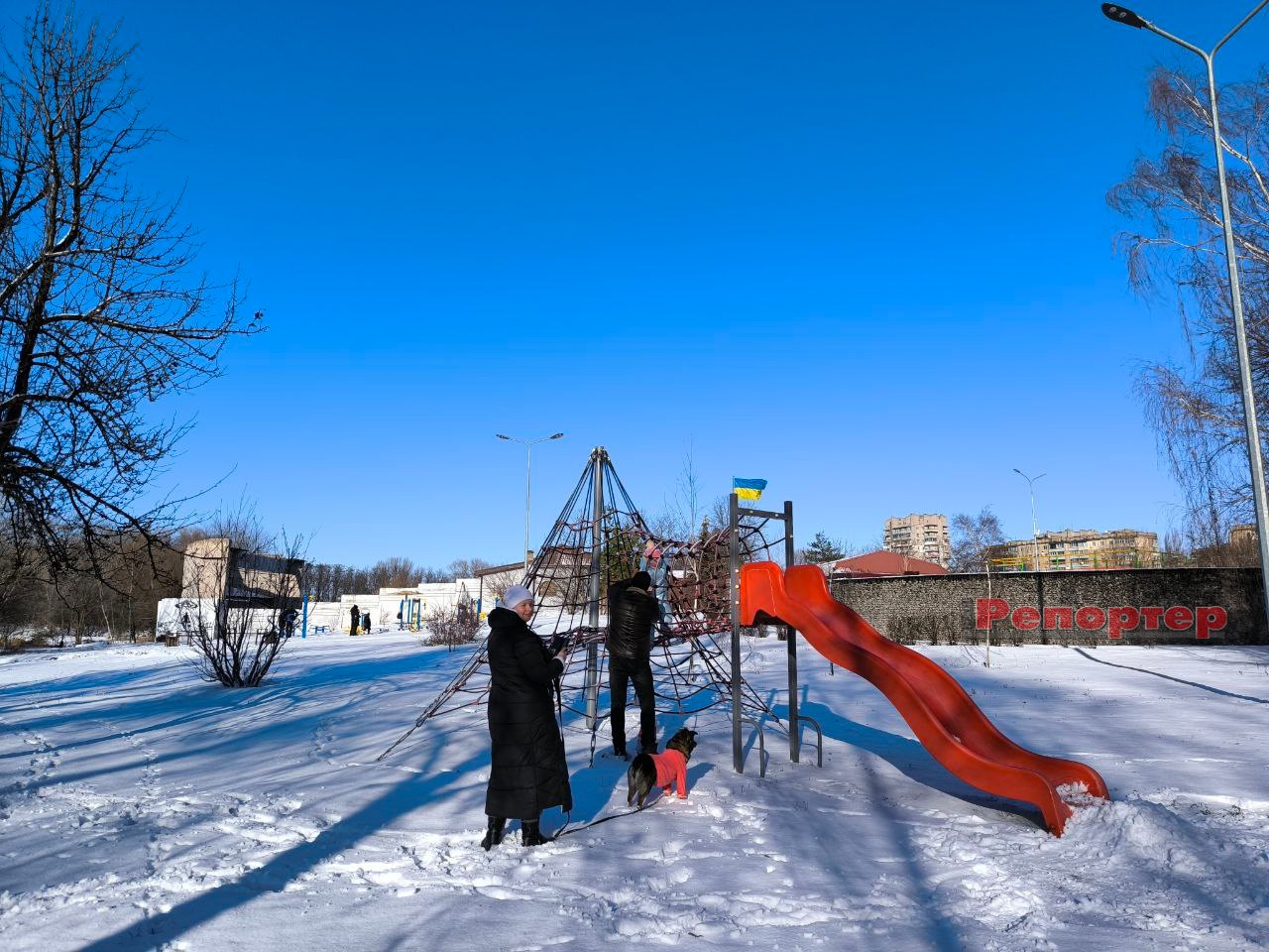 Навіть взимку тренажери і дитячі майданчики не стоять без діла – юні відвідувачі парку підкорюють «павутинки» та гірки. Батьки супроводжують їх разом із домашніми улюбленцями, вдягненими у теплі комбінезони.