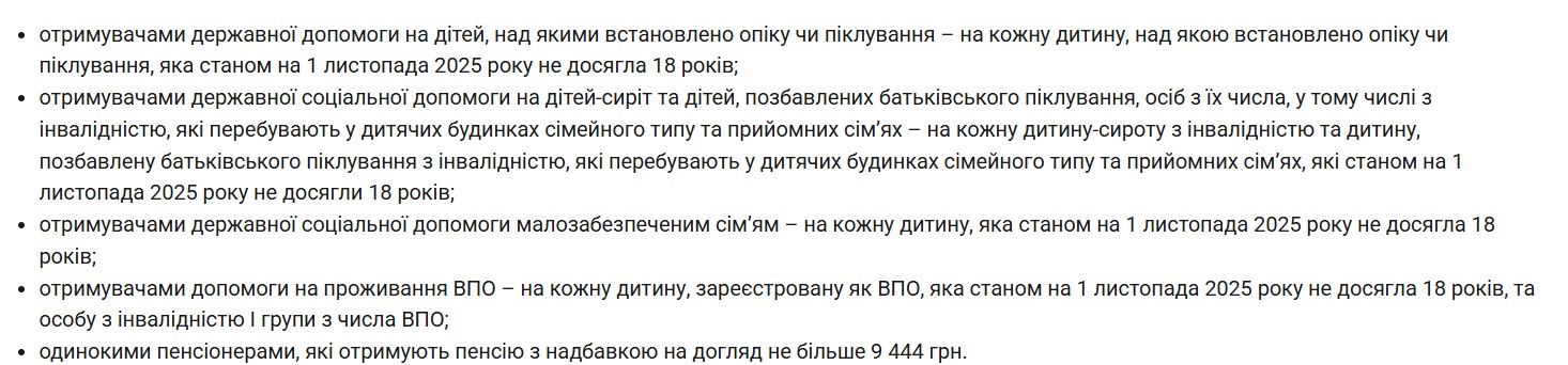 Право на отримання 6 500 гривень мають особи, які станом на 1 листопада 2025 року є: