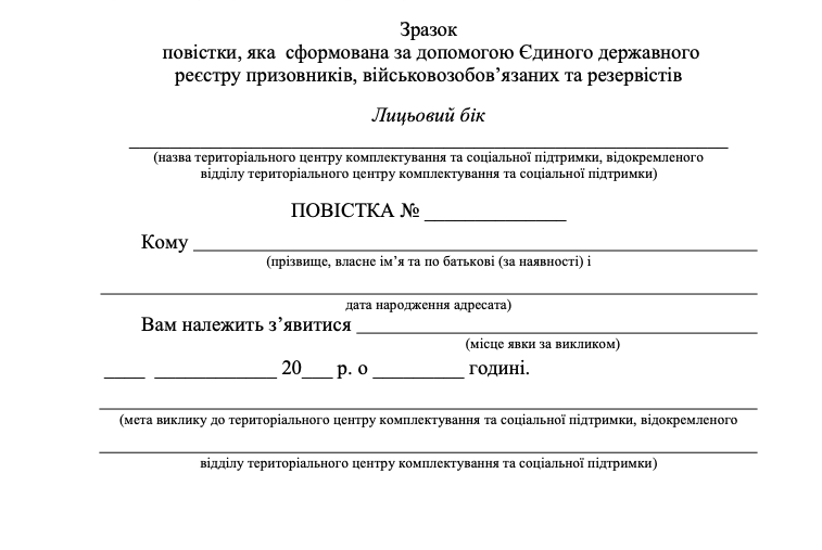 - прізвище та власне ім’я керівника районного (міського) ТЦК або його відділу, дата накладення кваліфікованого електронного підпису – для повісток, сформованих за допомогою Єдиного державного реєстру призовників, військовозобов’язаних та резервістів.