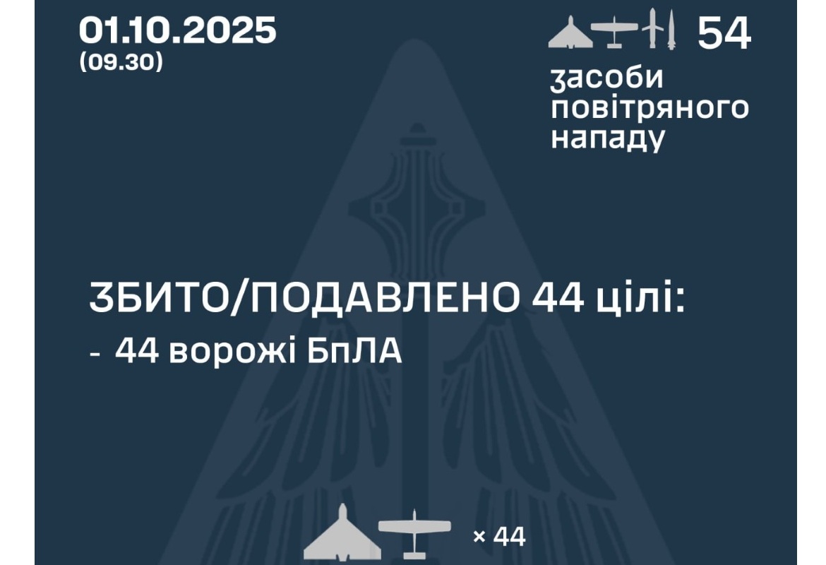 За попередніми даними станом на 09:30, протиповітряною обороною збито / придушено 44 ворожих БпЛА типу Shahed, “Гербера” і дронів інших типів на півночі, сході та в центрі країни.