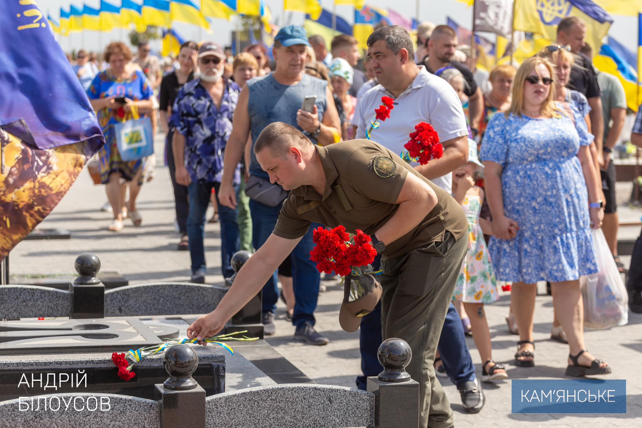 Мер Андрій Білоусов разом із родинами Героїв, начальником Кам’янської РВА Олегом Гапічем, депутатами міської ради, керівниками правоохоронних органів, військовими, молоддю та громадськістю поклали квіти до меморіалів на майдані Героїв та на Алеї Слави.