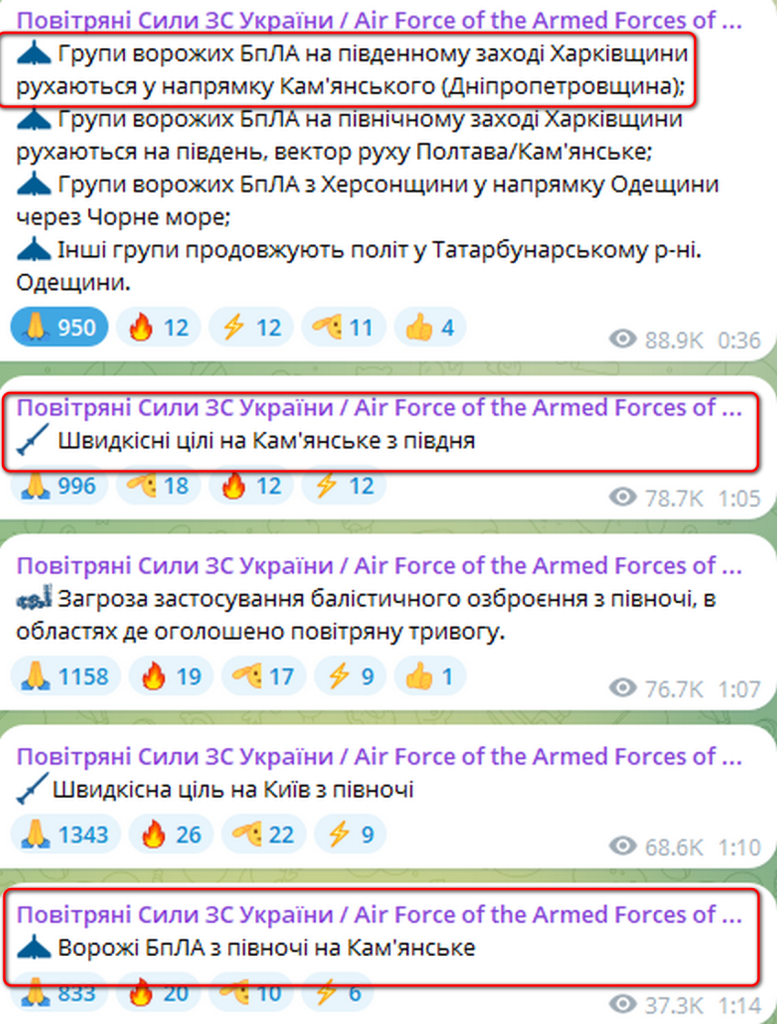 У Кам’янському чутно вибухи та роботу ППО. Моніторингові телеграм-канали закликають містян залишатися в укриттях.